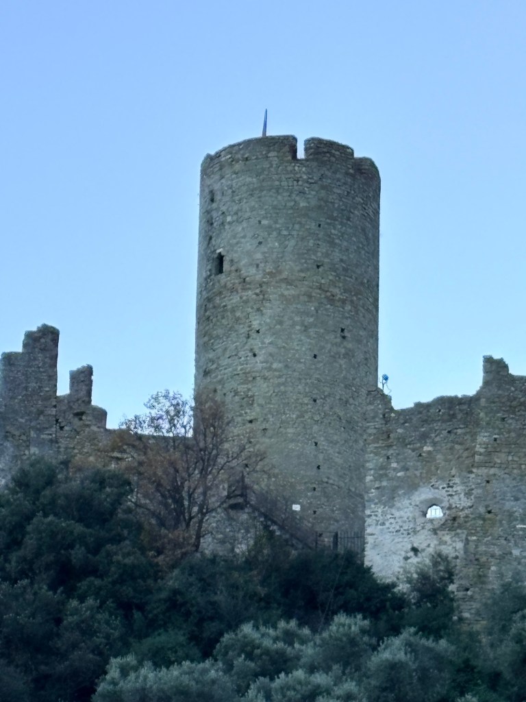Una rapida occhiata a varie app confermava che dal cimitero il castello era vicinissimo e quindi siamo salite a mezza costa. Il sentiero è percorribile con qualunque tipo di scarpe, pure con le caviglie con l’osso (cioè la spina calcaneale). Certo, finisce al cimitero ( cappella chiusa ma ingresso esterno aperto). Dal piazzale non si può fare altro che ritornare sulla strada asfaltata e cercare l’ingresso, che comunque è ben segnalato. Peccato che il castello fosse, indovinate un po’, chiuso. O meglio abbiamo avuto la netta impressione che ci abbiano chiuso il cancello in faccia – erano la 16,30 e la chiusura era alla 17 e forse mezz’ora non era sufficiente per la visita, chissà. Comunque, se abbiamo capito bene dal cartello, l’apertura dovrebbe essere domenicale.