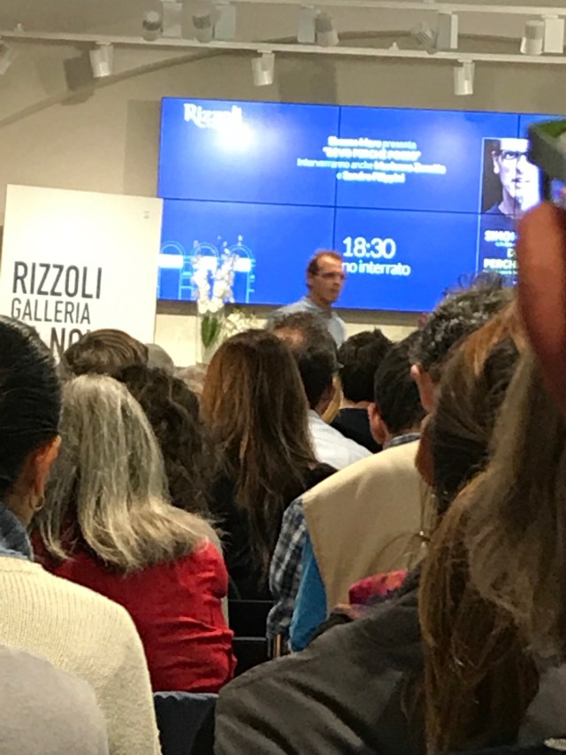 Mercoledì sono stata a Milano per la presentazione del nuovo libro di Simone Moro, Devo perché posso, edito da Rizzoli, scritto con Marianna Zanatta, alla Rizzoli in Galleria. Se devo essere sincera non amo molto le presentazioni, perché negli anni ne ho organizzate parecchie, ma certamente la saggistica specialistica non attira le folle, e i testi universitari tendono ad essere faccende per happy few. Invece nel giro di un mese e mezzo ho partecipato a due presentazioni affollatissime, per ragioni diverse. Cognetti, prima del successo, enorme per il mercato italiano, del suo libro e dello Strega era relativamente sconosciuto e a Verbania la gente voleva vedere lui , me compresa, dopo aver letto il suo libro. Simone Moro è un personaggio pubblico, che ha saputo usare i mezzi di comunicazione molto bene, per quello che sono, e rimanendo sostanzialmente se stesso, cosa di per sè già non facile, per diffondere le sue “imprese”, il che è parte di quello che è l’alpinismo attuale. Fa bene a farlo, lo sa fare in maniera adeguata, e la maggior parte delle persone accorse mercoledì sera, me compresa, erano lì per vedere lui. Con o senza libro, e non me ne voglia Simone Moro. E per altro, oltre ai soliti milanesi chic che vanno dove fa figo, di praticanti e appassionati di montagna ce n’erano di sicuro, anche se dissimulati in abiti da pomeriggio (e d’altro canto non eravamo in una palestra ma in una libreria). Lo confesso, il libro non l’ho ancora letto, anche se alcuni dei precedenti stanno nella mia biblioteca (Cometa sull’Annapurna e In cordata, scritto insieme a Mario Curnis), ma come ho già detto, mi interessava ascoltarlo dal vivo. Mi sono divertita, e ho scoperto alcune cose di Simone che non sapevo – d’accordo le avrei scoperte leggendo il libro, probabilmente, ma sentirle raccontare, ovviamente , ha un fascino diverso. Mi é piaciuto in particolare l’elogio del fallimento, approccio sensibile alla montagna, perché come gli racconta Riccardo Cassin, l’alpinista migliore è quello che torna a casa vivo (e Cassin infatti è vissuto ben 101 anni). E diventare il nuovo Messner, il suo idolo della giovinezza (Moro compirà cinquant’anni nelle prossime settimane), implica quasi naturalmente essere lì per raccontarlo.