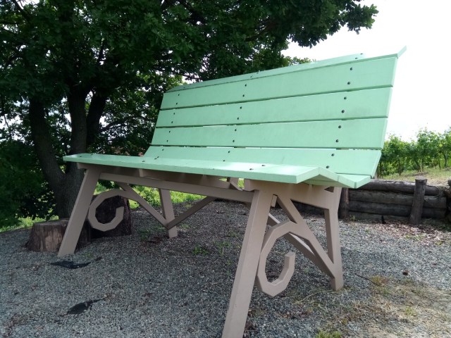Trovare la panchina, dove Alberto era già stato non è stato semplicissimo, ma quando anche Google fallisce – capita se non c’è segnale, ask Enrico, quando riprende il segnale, e ti darà le dritte giuste – in realtà mentre le dava io ho scorto la panchina in cima alla collina e ho cercato un posto per lasciare la macchina. Le panchine si trovano su crinali, dove la vista è particolarmente ampia, e sono raggiungibili solo a piedi. La nostra nella fattispecie è in un luogo bello aperto, e fortunatamente domenica il tempo era fresco, altrimenti lì sopra si rischia di cuocere. Veramente, siamo arrivati sopra e sono arrivati anche i lampi, e poi la pioggia ( vedi la continuità con il post precedente) . Se poi avete un’auto con il pianale basso come la mia, non vi conviene lasciarla in mezzo alle vigne, la seconda volta il furgone si è impantanato…