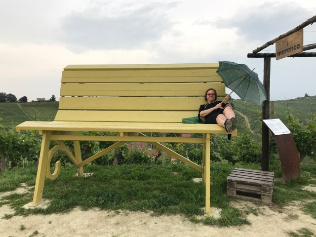 Giusto per ricordare a Junkers e soci che viviamo nel paese più bello del mondo ( sì, siamo anche un paese di cialtroni, che sta per essere governato da altri cialtroni, ma chi volevate che eleggessimo, DeGasperi?) ho scoperto – in realtà lo ha scoperto il cugino piacione che gira per la provincia e quelle limitrofe per lavoro, una serie di panorami mozzafiato nella zona di Acqui, puntellati dalle cosiddette “panchine giganti dell’amicizia”. L’ideatore del progetto è il designer americano Chris Bangle, che trasferitosi nella Langa, a Clavesana, ha costruito nel 2010 la prima panchina nella sua tenuta. La cosa ha preso piede e lui ha fornito il progetto della panchina originaria gratuitamente. A condizione che le panchine fossero collocate in luoghi panoramici e a disposizione di tutti. Ad oggi sono 47, qui potete trovare l’elenco completo e la mappa. La nostra prima panchina è stata quella giallo moscato, vicino ad Alice Belcolle ( noi venivamo dalla Taverna della Baccante di Bruno, ma anche ad Alice ci sono bei posti per mangiare).