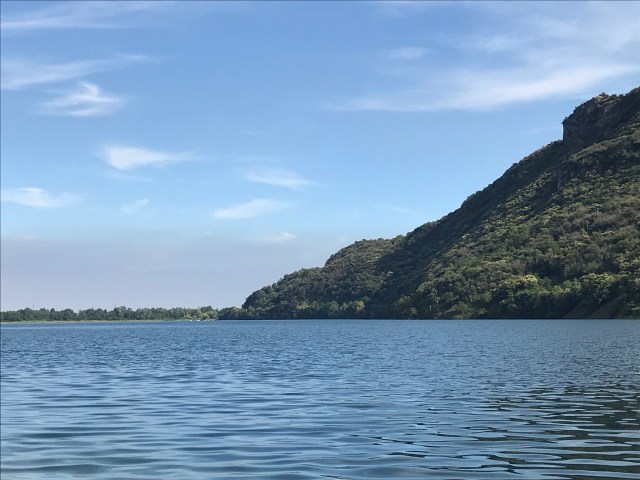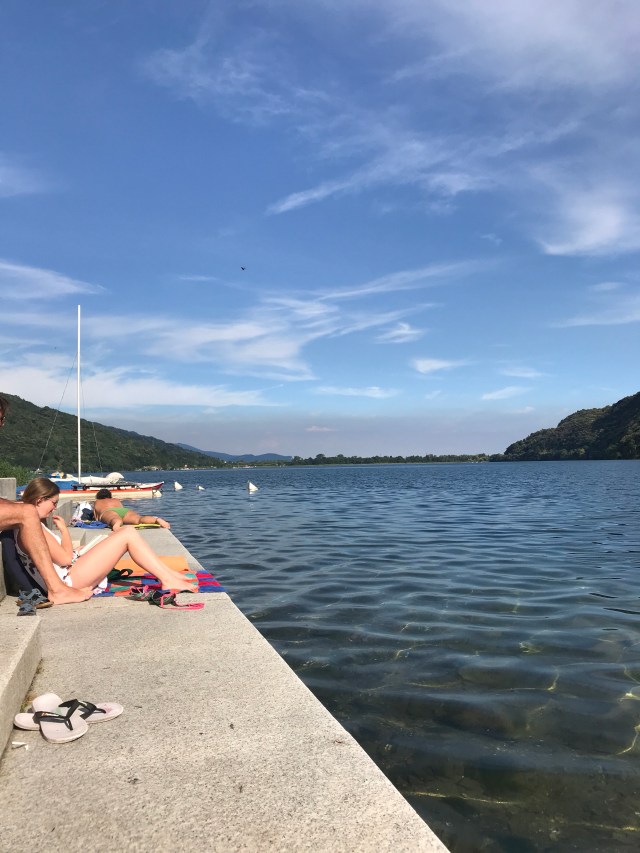 No, è finalmente arrivate l’estate ed è cominciata la mia stagione balneare. Forse dovrei coniare anch’io un nuovo hashtag: oggiilcieloèblulago. La foto uno spiega tutto. Pontile deserto, io che leggo l’ultimo Camilleri con la schiena derelitta appoggiata ad un asciugamano ripiegato, due turisti tedeschi a sinistra, un’altra signora che legge sdraiata, e dietro a me tre vecchietti che spaziano dallo stato dei calli (Eh, l’ho ereditato da mio padre, non posso mettere le scarpe chiuse, mi vengono certi duroni), al fatto che portare i bambini ai centri estivi è diventato una moda (mia nuora lavora, ma ci sono tanti che li portano lo stesso…Una moda) alle colonie del Ventennio tutti che marciavano e facevano il saggio finale. Dato il tono di voce, li sentivano probabilmente sino ad Omegna. Dopo i vecchietti ( ma non volevi fare due passi?) una lunga nuotata insieme alle anitre, in un’acqua ancora freddina, ma non spiacevole, specie dopo aver trascorso due capitoli di Camilleri con i piedi a mollo. Tra due settimane l’acqua sarà troppo calda, come gli stessi vecchietti lamentavano già lo scorso anno. Il pontile della Società di pesca dilettantistica è la mia spiaggia personale, la Fugascina in piazza è il mio Bar Lume. Ho anche una piscina personale, i vecchietti mi salutano ( ricordate, cinquant’anni a Courmayeur e nessuno mi ha offerto nemmeno un caffè, la signora Barbara dell’Hotel Dolonne non fa testo, perché è lombarda.) e credo di aver scoperto venerdì la pace interiore.