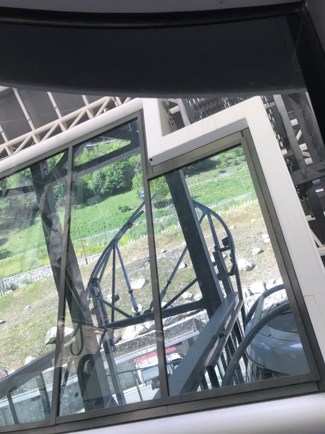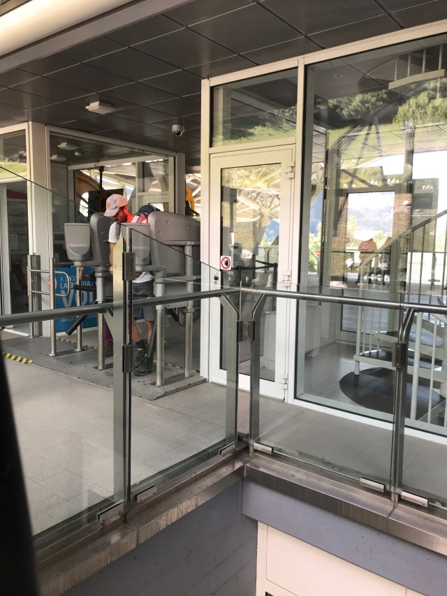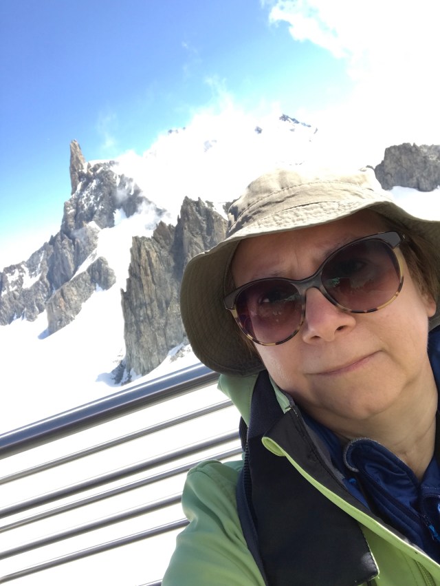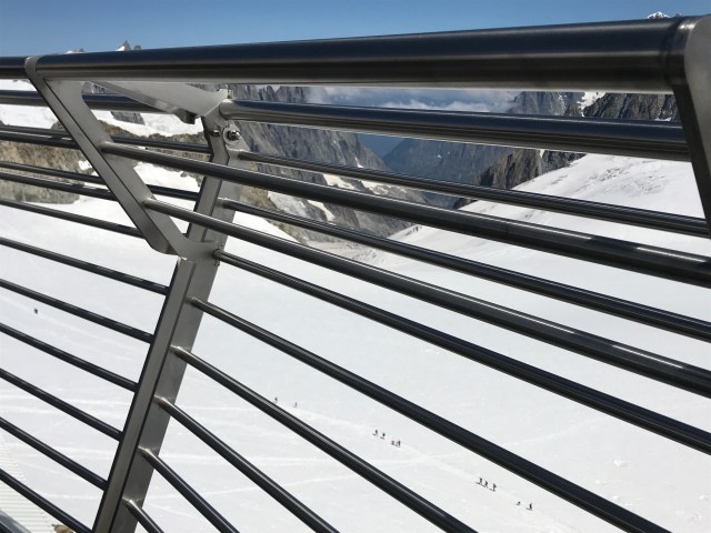 Per quanto strano sia, non ero mai stata sullo Skyway, la nuova avveniristica funivia che ha sostituito quella che già ai tempi della mia infanzia era l’ottava meraviglia del mondo (con un po’ di sciovinismo francese). Avevo fatto anche tutta la traversata, in un momento particolarmente ventoso che ci aveva costretto ad una lunga attesa alla Aiguille du Midi. Non mi sono fatta mancare nulla : Rifugio Torino – Punta Helbronner dentro e fuori ( dentro vuol dire la scalinata tunnel che forse c’è ancora, ma spero anche lei rinnovata), passeggiata sul ghiacciaio adeguatamente bardati verso il dente del Gigante per evitare i turisti in scarpe da tennis , che purtroppo ci sono sempre stati. Quest’anno, lo dico subito, non ho avuto voglia di avventure: l’attrezzatura c’era, ma la testa forse no, e ho preferito godermi lo spettacolo. Lo Skyway è un’esperienza da fare. La rotazione della cabina è fluida, e a meno di essere del tutto privi di acclimatazione, non provoca nessun fastidio o capogiro. Diciamolo, però, se partite da Milano o da Genova alle otto e siete alle 12 a 3000 metri e vi viene mal di testa, non è colpa della funivia, si chiama mal di montagna. E voi non avreste dovuto essere lì. Non intendo ovviamente colpevolizzare nessuno, men che meno i turisti, o i giapponesi onnipresenti: lo Skyway è sia uno strumento per i professionisti, sia una attrazione turistica moderna e di eccellente livello. Anche il ristorante al Pavillon è buono, e non eccessivamente caro, e il personale riusciva ad essere cordiale anche in mezzo alla folla di un giorno di deciso bel tempo ( non perfetto, perché verso mezzogiorno le nuvole salivano dalla vallata, ma oggettivamente davano contorni fiabeschi al dente del Gigante e alla Noire). E ovviamente c’era di tutto. E pregi e difetti si amplificano in uno spazio grande venti metri quadri o giù di lì.