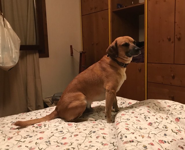 Fiero, nella sua posa solenne, là dove non dovrebbe stare, con tutta la pena che ci siamo date, ma pazienza, Tobia è un cane da montagna. Non chiedetemi di che razza è, tanto non basterebbe il DNA a dirlo, ma certo è un cane da caccia mancato ( nel senso che nessuno in “famiglia” va a caccia, lui l’istinto lo avrebbe, ma può sfogarsi solo con le lucertole) . Comunque da qualche giorno vive un perenne stato di orgasmo olfattivo.