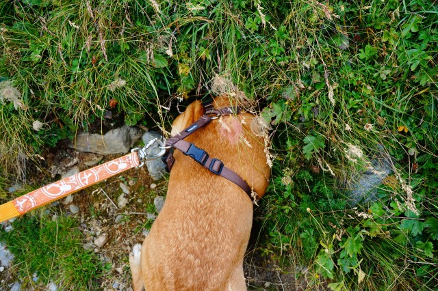 Il primo fischio di marmotta lo abbiamo sentito praticamente al ponte sulla strada del Gavia . Poi uno ogni cinquanta metri . Nel mentre Tobia passava da un orgasmo olfattivo all’altro. E cercava di infilarsi in ogni dannato buco di marmotta che vedeva. Come si vede dalla foto, lo abbiamo tirato fuori con fatica in due. Quasi al passo, si sono fatte vedere, dopo un ultimo fortissimo fischio che ci ha fatto sobbalzare.