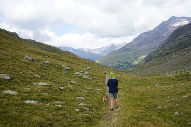 Camminare nei dintorni di Bormio è una meraviglia, c’è solo l’imbarazzo della scelta e delle valli da percorrere . In Valfurva, dopo Santa Caterina, lungo,la strada del Gavia (appena meno affollata dello Stelvio, abbiamo anche trovato un cagnolino nel trasportino della bici). Tobia non ci consentiva escursioni troppo pericolose – avete presente, il cane dà uno strattone e si precipita tutti e due nel dirupo?. Però la valle dell’Alpe ci ha fornito una bella e comoda passeggiata di un’oretta, che ci ha portato ad affacciarci sino al passo dell’Alpe e dalla parte opposta dove si scende fino a Frontale.