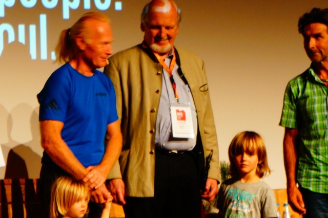 Alla fine, ho avuto l’intervista che sognavo e di cui renderò conto prossimamente. Tamara Lunger è in realtà una persona disponibilissima e davvero speciale, con un’enorme luce interiore. Nella brutta istantanea che vedete qui sopra e che si riferisce alla serata finale, mi ha colpito quella immagine, che anche a lei piace molto, quel toccare il cielo con in dito che l’andare in montagna ti dà, e te lo dà sempre, che tu sia come lei la più forte alpinista vivente, o come Beat Kammerlander, che ha ritirato il premio della Paul Preuss Gesellschaft insieme ai suoi bambini e che come Preuss è un esteta del gesto, quasi un acrobata del rotpunkt, capace di volare, risalire e ripetere in libera una parete “di casa”, nel Montafon, già scalata e attrezzata due anni prima e poi liberata. E non stiamo parlando di un vado la scalo e torno (c’è anche questo, ovviamente, le gare di arrampicata si fanno così), ma di una ricerca. Che prende tutto il tempo necessario: volare può voler dire farsi male a un ginocchio – certo sei assicurato, ultrassicurato, ma il peso del corpo in caduta provoca strane traiettorie, e alla fine volente o nolente vai a sbattere . E allora aspetti di essere di nuovo al top della forma, perché a 58 anni – sì siamo coetanei… – non si guarisce così in fretta, anche per un top athlete.