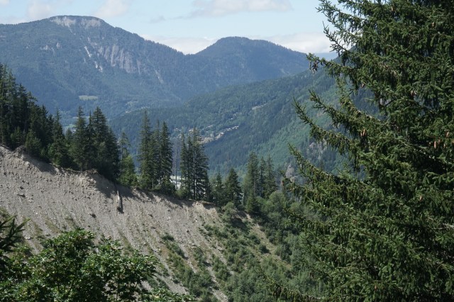 La prima foto è nota, perché l’ho già postata sui social. È il ghiacciaio di Bossons, un tempo meravigliosa lingua glaciale che sfiorava la statale del traforo sul versante Francese del Monte Bianco. Lo potevi vedere da vicino con una facilissima passeggiata in partenza dal piazzale del traforo, arrivavi allo chalet du Cerro, prendevi una coca e ascoltavi i seracchi cadere nelle giornate calde; una passeggiata che non amavo particolarmente proprio per il caldo. Adesso, abbandonare la macchina nelle vicinanze del traforo non è più possibile perché dal versante italiano non puoi fare inversione di marcia, ma io ho appena astutamente acquistato ( mi è impossibile entrare alla Buona Stampa di Courmayeur senza acquistare qualcosa) la nuova Escursioni a Chamonix di Marco Romelli (Villa di Teolo, PD, Idea montagna, 2019), dove a pag. 87 è descritta l’escursione alla cascade du Dard con partenza appunto da Chamonix. Io venivo da Courmayeur, potevo lasciare l’auto nell’apposito parcheggio, e dopo la cascata, prendere il ben descritto prolungamento e salire al Cerro e così spendere bene il mio tempo in una giornata particolarmente soleggiata e calda. La cascata come potete vedere dall’ultima foto era più spettacolare del solito, e con una facile passeggiata che traversa sotto la strada attraversa con una spettacolare passerella il torrente de la Creuse ( persino troppo spettacolare) all’altezza del bivio per la Para e la Gare de Glaciers e infine, anziché prendere lo stradone che è percorribile dalla Jeep del Cerro, ti conduce a metà dello sterrato, attraverso il bosco con la sola compagnia dei trail runners che vanno molto più veloce di me. Così arrivo tranquilla al Cerro e quel che si vede da lì è intuibile dalla seconda foto dall’ alto: betulle e ghiaioni. Del ghiacciaio che scorreva lì sotto , perfettamente raggiungibile da un escursionista esperto, nessuna traccia.