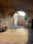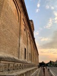Poi non contenti della camminata siamo scese lungo la via francigena lastricata con i nomi dei benefattori che hanno comperato un mattoncino. Camminarci sopra ė comodissimo, pensare alla commercializzazione della fede molto meno comodo – una delle ragioni per cui preferisco non andare a Lourdes…scendere da Assisi al tramonto con la rocca alle spalle e la palla del sole davanti, un po’ meno rovente di quanto lo era stata durante il giorno ( alle corte, temperature saldamente oltre i trenta gradi, un caldo boia) e capisci perché da queste parti molte persone avevano esperienze mistiche, e Giotto dipingeva come ha dipinto…