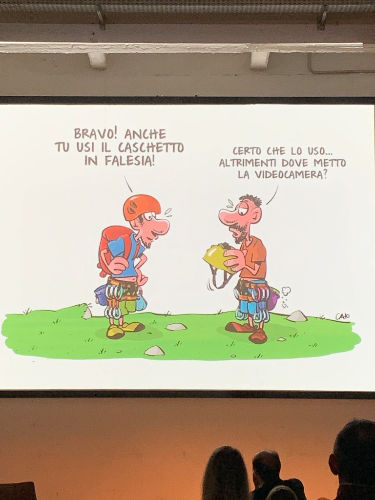Il secondo incontro interessante è stato con le vignette di Caio (https://www.caiocomix.com/). Un mito, che mette gentilmente e argutamente alla berlina vizi e virtù – soprattutto i primi – della comunità di arrampicatori, chiodatori, boulderisti fanatici e così via. E che, e questo non lo sapevo, con il fratello ha gestito per anni la zona di arrampicata in Valchiusella intorno al rifugio Piazza, e il rifugio medesimo. Devo averci parlato, a lui o a suo fratello, anni fa quando frequentavo di più quella splendida valle, che ancora è uno dei miei luoghi preferiti. Poi, per una di quelle ripicche interno – Cai di cui noi piemontesi siamo specialisti (veramente, in ogni campo e nel mio natio Mandrognistan potrei fare un elenco da durare da qui a Natale), è finito tutto. Poi non lamentiamoci se a Milano fanno le Olimpiadi – senza voler generare polemiche sulle grandi opere e blablabla. noi è si interrotto un esperimento perfettamente sostenibile e ad impatto zero.