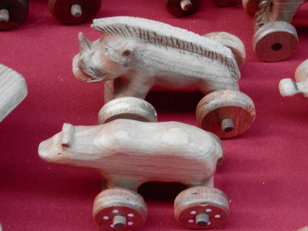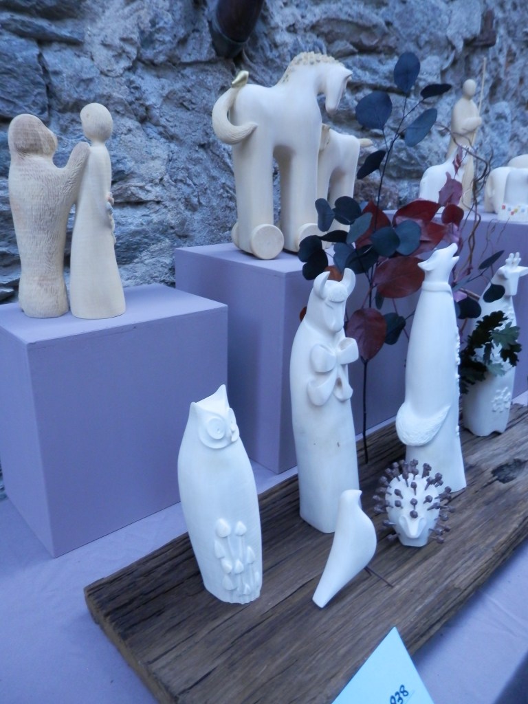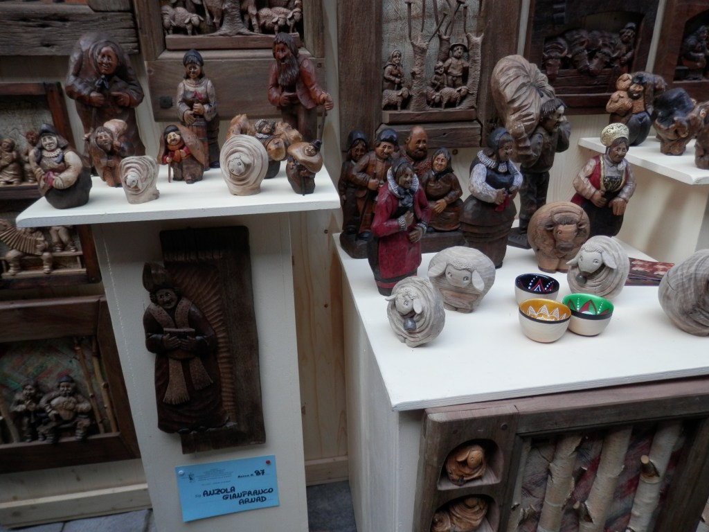 C’erano diversi Tatà cinghiale, cosa di cui dovremmo informare l’Andrea Pennacchi di Propaganda Live. La statua dello pseudo San Michele Arcangelo era un possibile acquisto di Luisa, ma l’Autore, mentre noi racimolavamo gli euro da prestarle, ha asserito essere in realtà un san Giorgio, come per altro si evince dalle lettere S.G scolpite sulla base. La cosa ha innescato una dotta discussione teologica, cui tornando anche il cugino piacione ha dato il suo contributo. L’abito (gonnellino da soldato romano e spada) fa il sangiorgio, ma le ali? erano ali, ve lo assicuro perché lo abbiamo preso in mano. Soprattutto, che fine ha fatto il drago? Sant’Orso ha l’uccellino, San Rocco il cane, San Giorgio il drago. Luisa non lo ha comperato e il mistero rimane.
