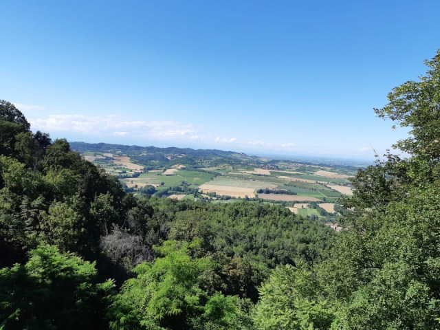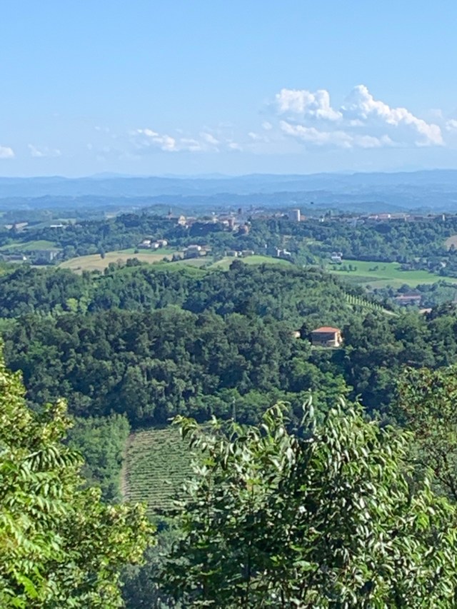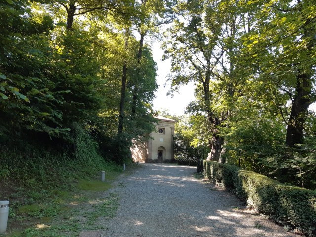 Così stavolta io Lulù e Marisa siamo partiti da Crea. Che è un altro buon esempio di come dovremmo sempre partire da ciò che ci circonda: infatti io c’ero stata l’ultima volta da fidanzata ( e mi sono sposata nel ’92), Lulù non la vedeva da sei anni e Marisa non c’era mai stata. A Crea hanno messoin atto tutte le adeguate misure di distanziamento, e anche la Chiesa ha gli ingressi contingentati. Non sono ancora conclusi i lavori di restauro e consolidamento del Paradiso, a causa di una frana che si è aperta in autunno. Le guardie forestali ci hanno detto che i lavori, sospesi per il covid, sono appena ripresi. La visita alle cappelle è interessante, e mostra tutte le varie fasi di splendore e ottocentesco abbandono che il sito ha subito. È soprattutto all’ombra mentre il primo tratto del cammino, la discesa e poi la risalita verso Moncalvo, che è proprio di fronte, no.