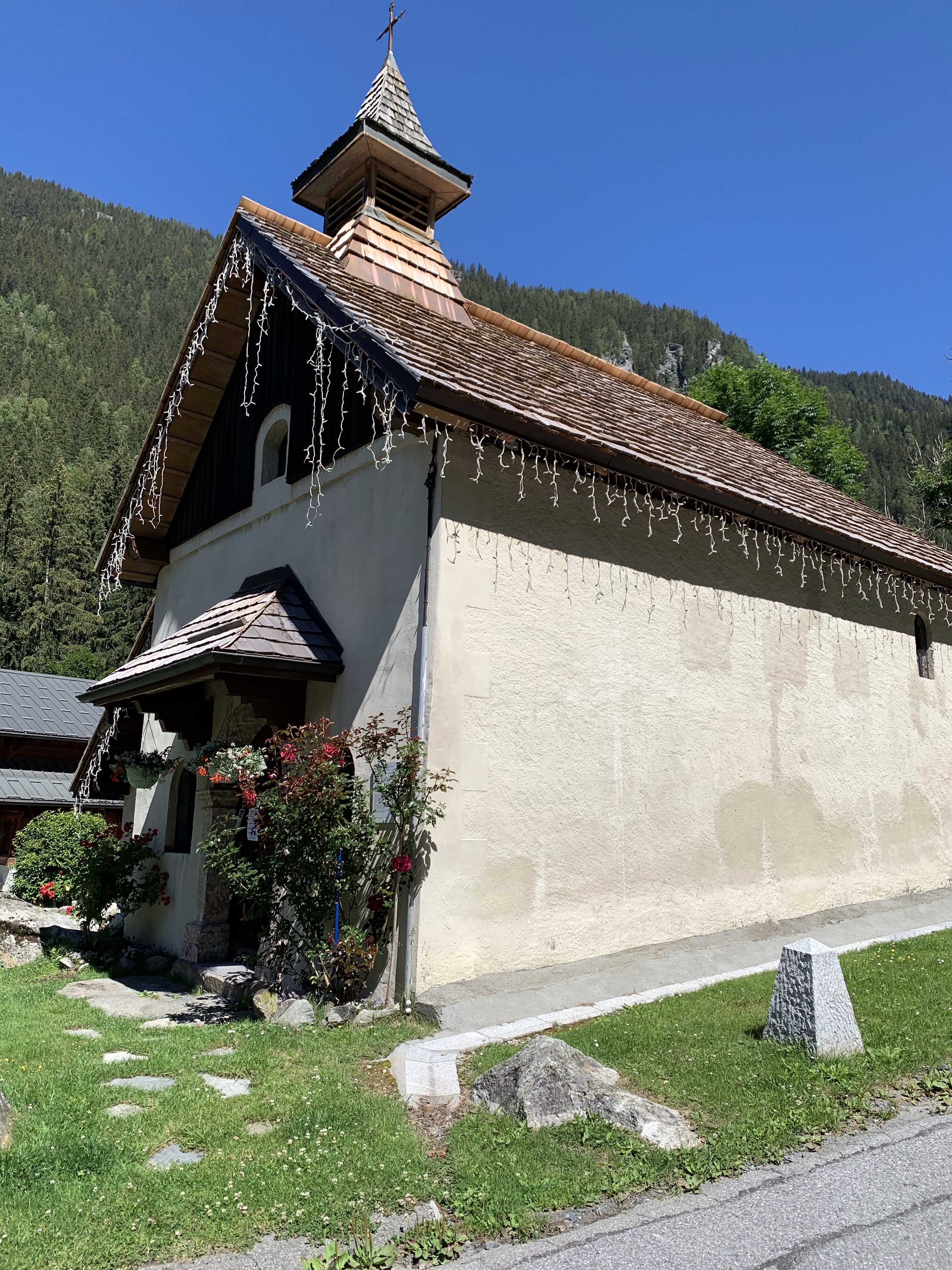 In ogni caso, l’itinerario parte da Tines, una frazione di Chamonix in cui hanno costruito delle abitazioni e un residence oggettivamente orrende, ma dove, lasciando l’auto nel solito slargo alla fine (erché non ho ancora capito se quello precedente è a disposizione del pubblico o no) ho trovato aperta la cappella di san Teodulo vescovo sodale di sant’Ambrogio ( e che mai in tutti questi anni ho trovato aperta). Una volta ammirato un bel ritratto tardo settecentesco del santo, bisogna tornare indietro, attraversare la strada, fare un primo tratto semiasfaltato in salita , seguendo le indicazioni e poi prendere il sentiero che dopo un altro tratto di salita porta sul Petit Balcon nord. Qui si rischia facilmente di perdersi, perché non ci sono più le indicazioni per le Sources, ma solo per Chamonix e per Le Levancher e le Chapeau, che sono le uniche da seguire. Si è comunque sul crinale morenico e si deve rimanere lì, sul sentiero in costante ma abbastanza comoda salita, e soprattutto all’ombra dei pini, il che consente di fermarsi o camminare senza dover cuocere al sole. Il primo belvedere , in realtà uno slargo nella foresta arriva dopo circa un’ora. Il sentiero risale risale ancora per un’altra oretta circa il costone della palestra di roccia. Poi mi sono persa definitivamente. Ricordavo che si doveva incontrare lo sterrato che proveniva da Le Levancher nei pressi del rifugio /chalet/buvette del Chateau e dopo un po’ di strada si arrivava al belvedere sul ghiacciaio. Ma dove ero io il sentiero pareva perdersi nel bosco. Quindi ho mangiato il mio panino e poi sono scesa a godermi un gelato a Chamonix.