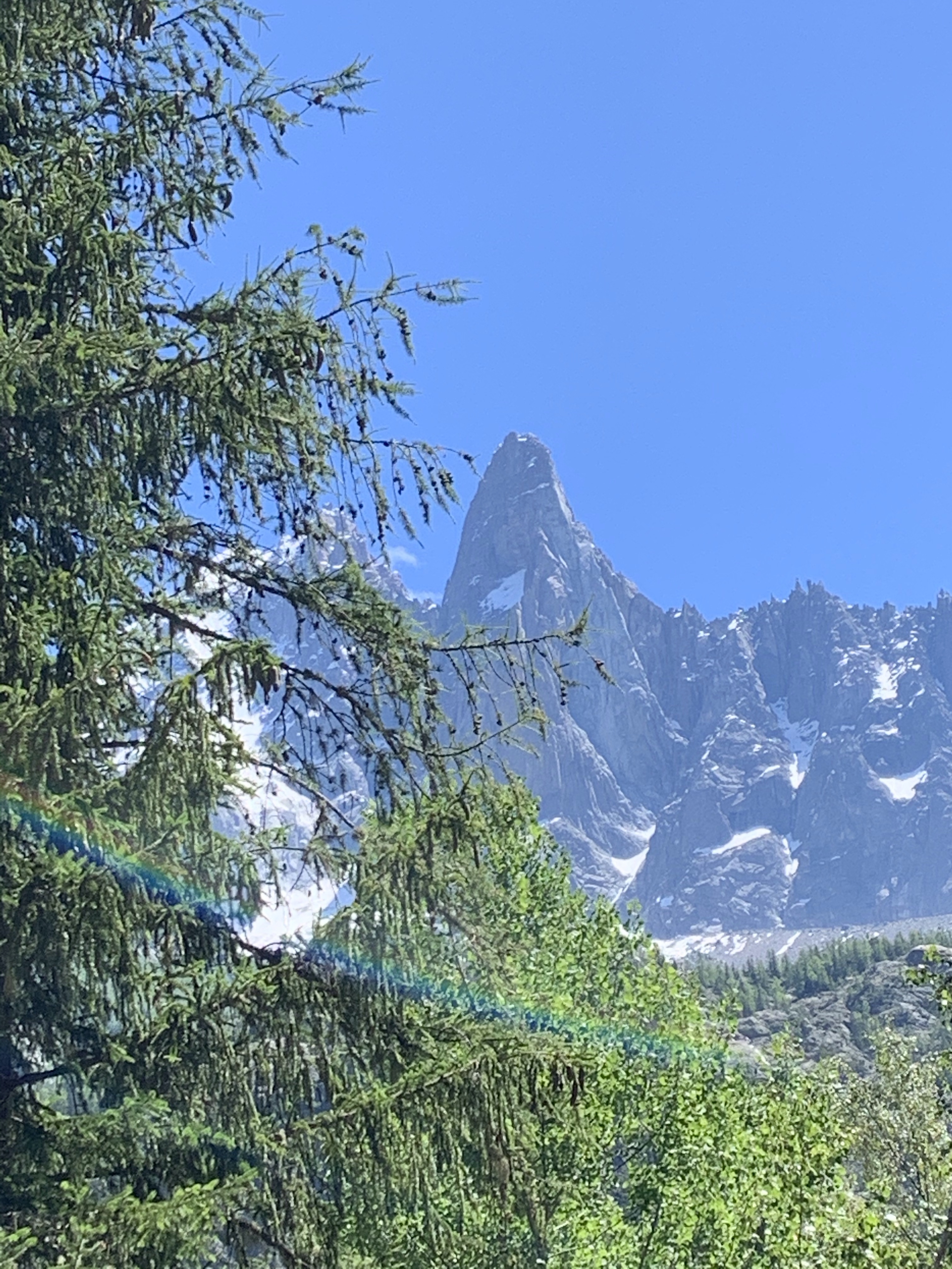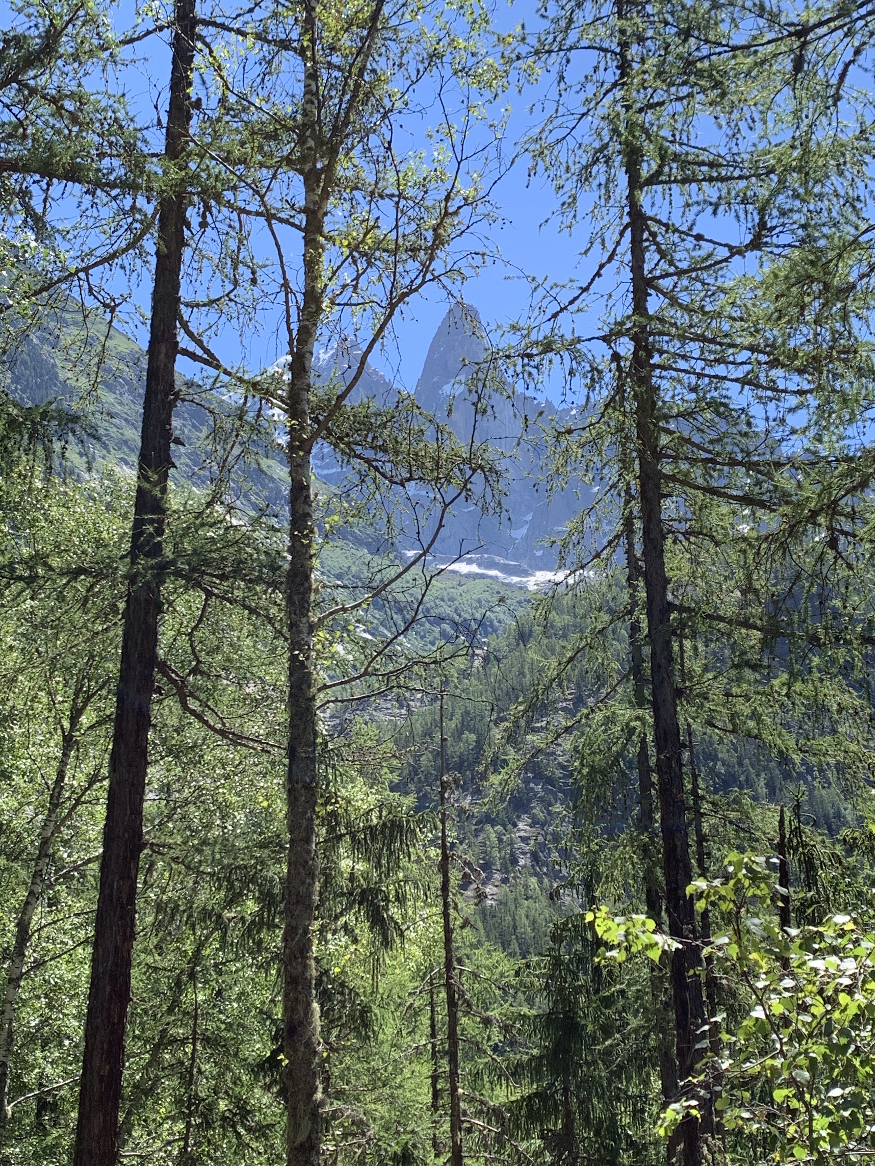 Questa volta ho deciso fare un sentiero che non ricordavo di aver percorso, e alla fine mi sono ritrovata su un sentiero balcone. Il sentiero era quello delle Sources de l’Arveyron, il torrente che si immette nell’Arve scivolando, o rotolando, dalle pendici del Dru e dalla Mer de Glace. In realtà il sentiero non arriva direttamente alla sorgente, ma ad un balcone panoramico con vista sul ghacciaio. Saltando direttamente alle conclusioni, il panorama non è così bello come poteva essere in passato e la causa, come potete immaginare, è la stessa, ossia il progressivo ritirarsi del ghiacciaio stesso verso il Montenvers a causa del riscaldamento globale. Non solo, in estate la vegetazione rende la vista ancora più problematica.