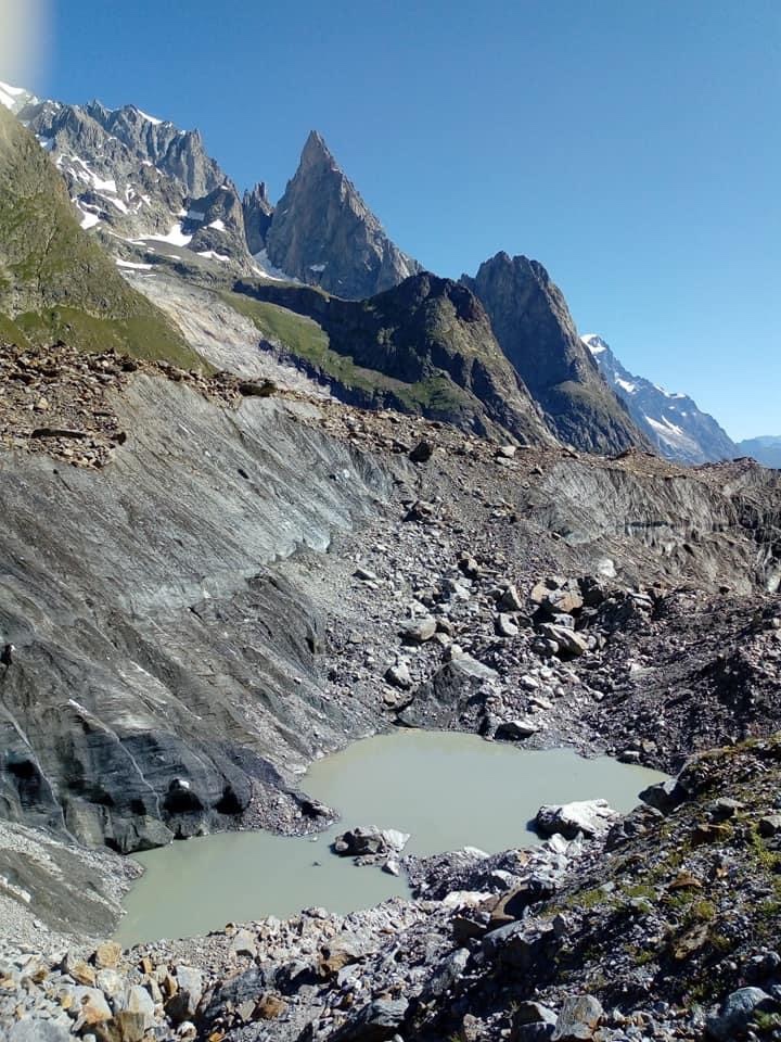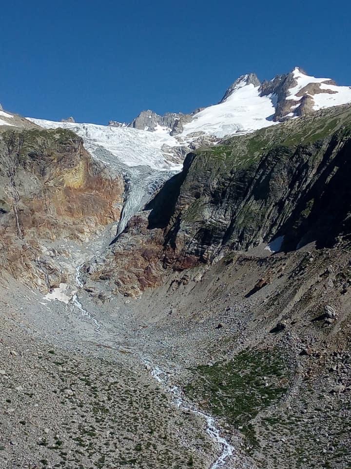 Se il torrente (la Dora di Veny) appare bene in salute, il lago quest’anno è molto più piccolo, senza la caratteristica forma a cuore che aveva mantenuto negli ultimi anni, ma con due pozze distinte. e uso il termine pozza non casualmente, perché davvero la superficie appare molto ridotta. Peggio sta andando al ghiacciaio di Pré de Bar, esattamente speculare (nel senso che chiude la val Ferret, come il bacino Combal -Miage chiude la val Veny). qui la lingua inferiore, che aveva la caratteristica forma circolare è quasi completamente scomparsa. Il bacino glaciale o quello che ne è rimasto è ormai solo nella parte duperiore. Ancora negli anni Novanta del secolo scorso, il nostro “gioco” preferito era andare a mettere le mani sul ghiacciaio, che si raggiungeva davvero con una semplice passeggiata. Non c’è davvero altro da dire.