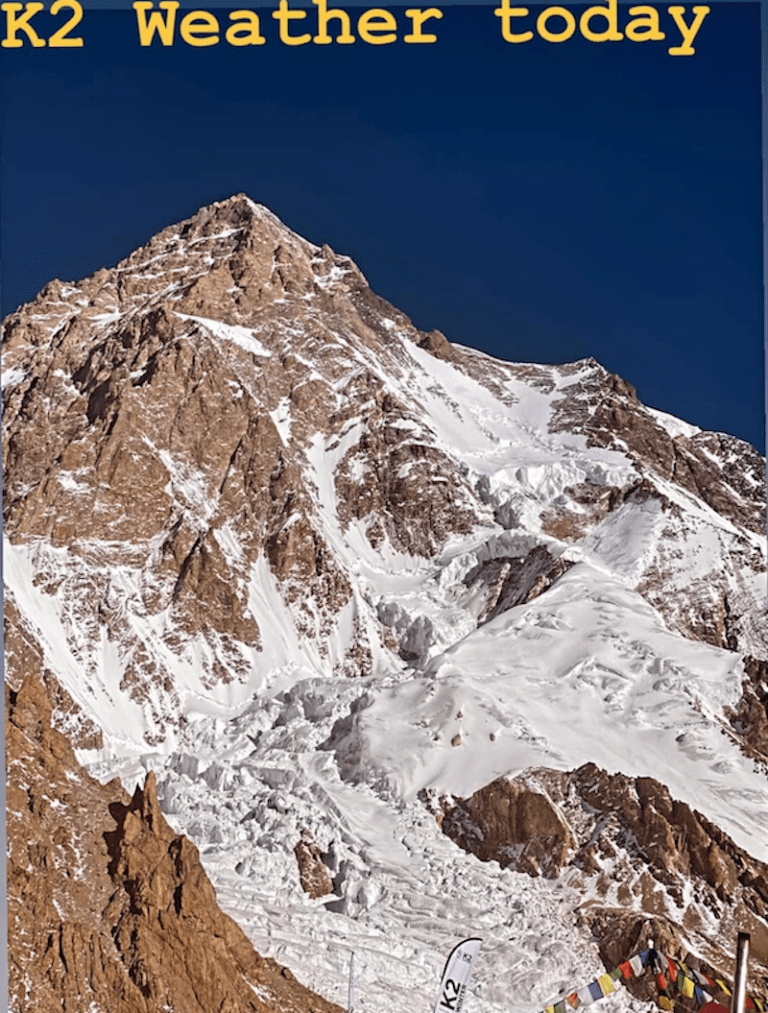 Come si vede, tempo e cielo cristallino, e a giudicare dalla foto ( postata dal team di Nirmal Purje) non c’è molta neve, soprattutto nella parte alta della montagna- il che non significa che faccia caldo.