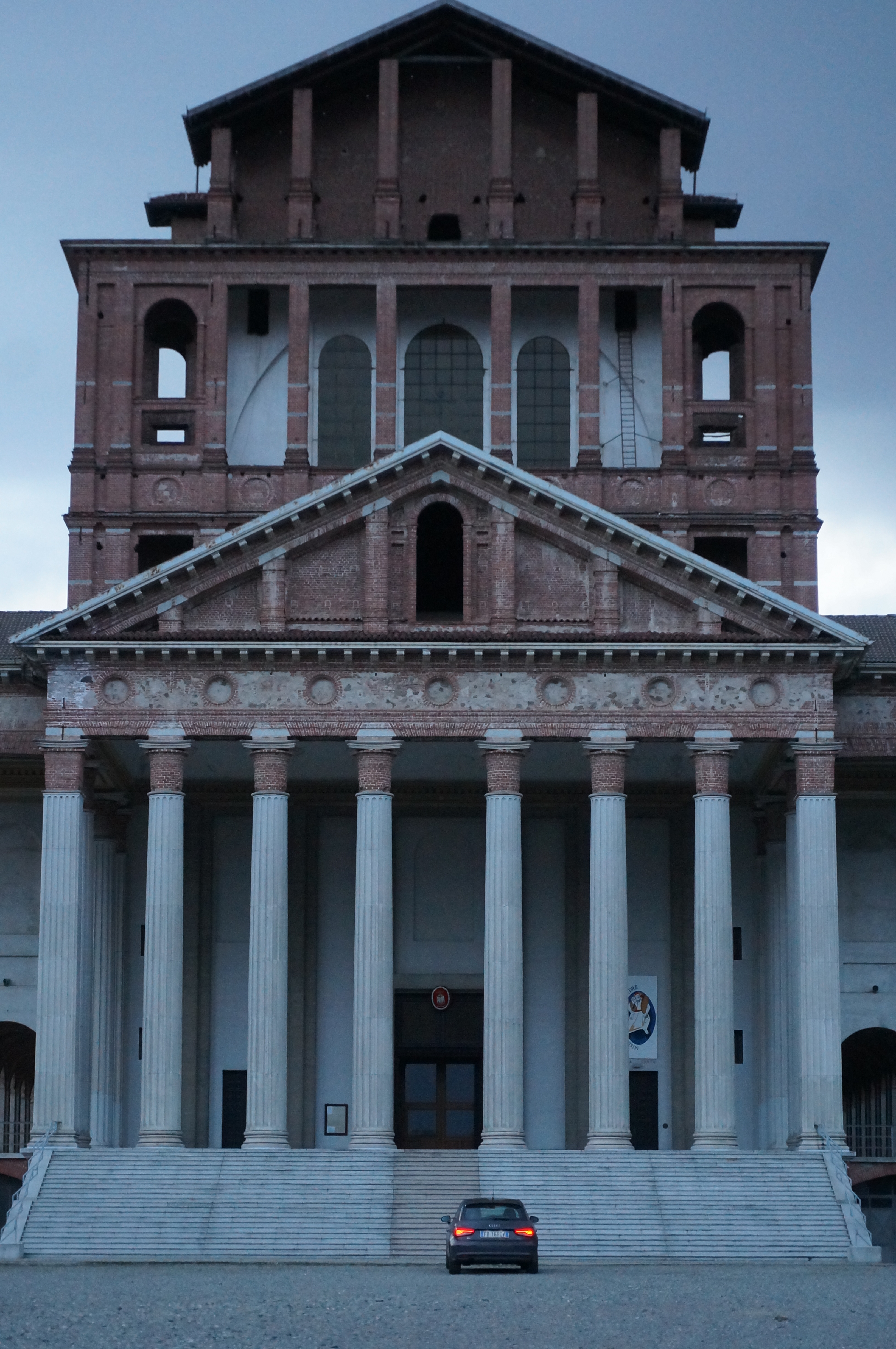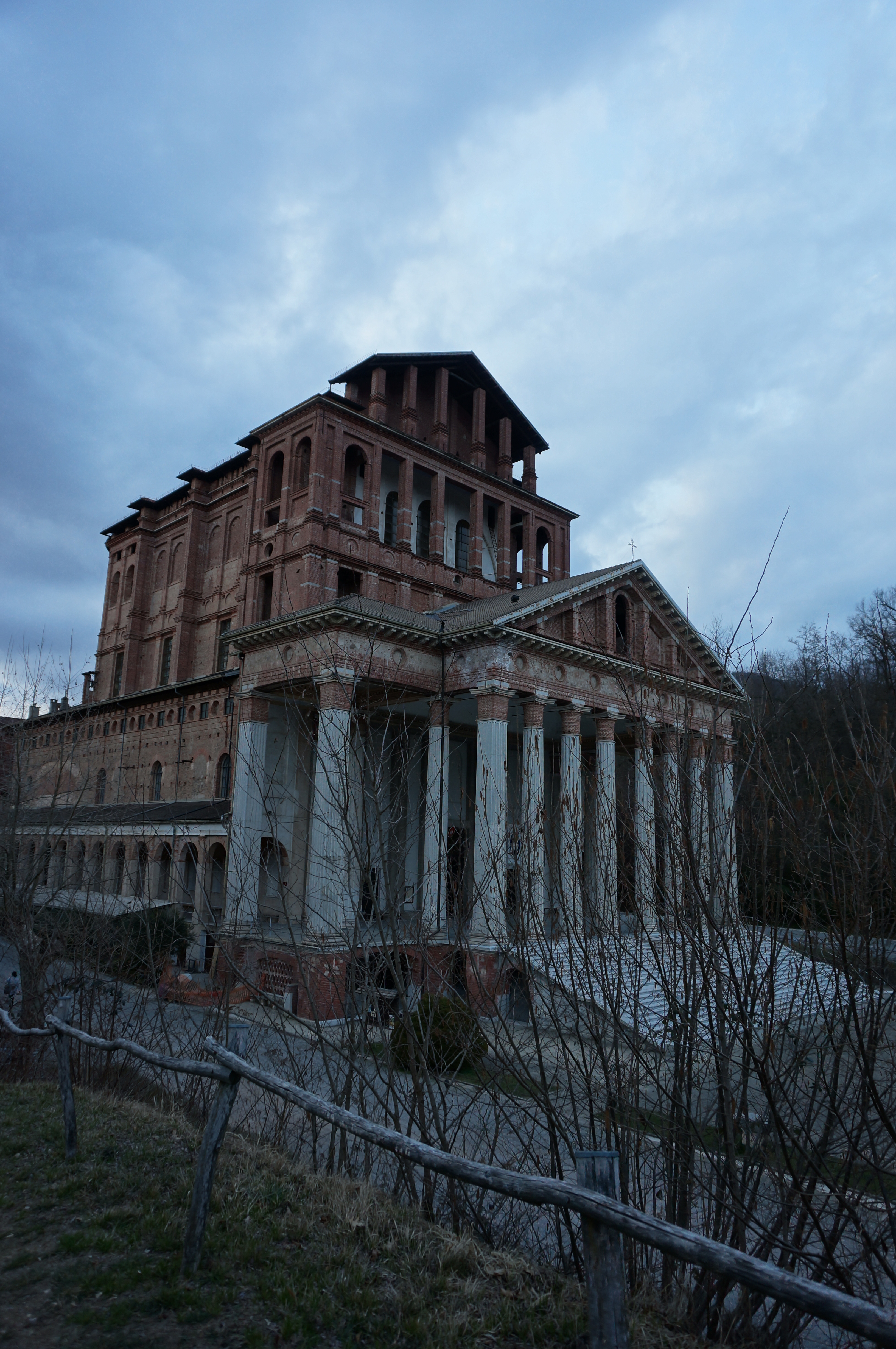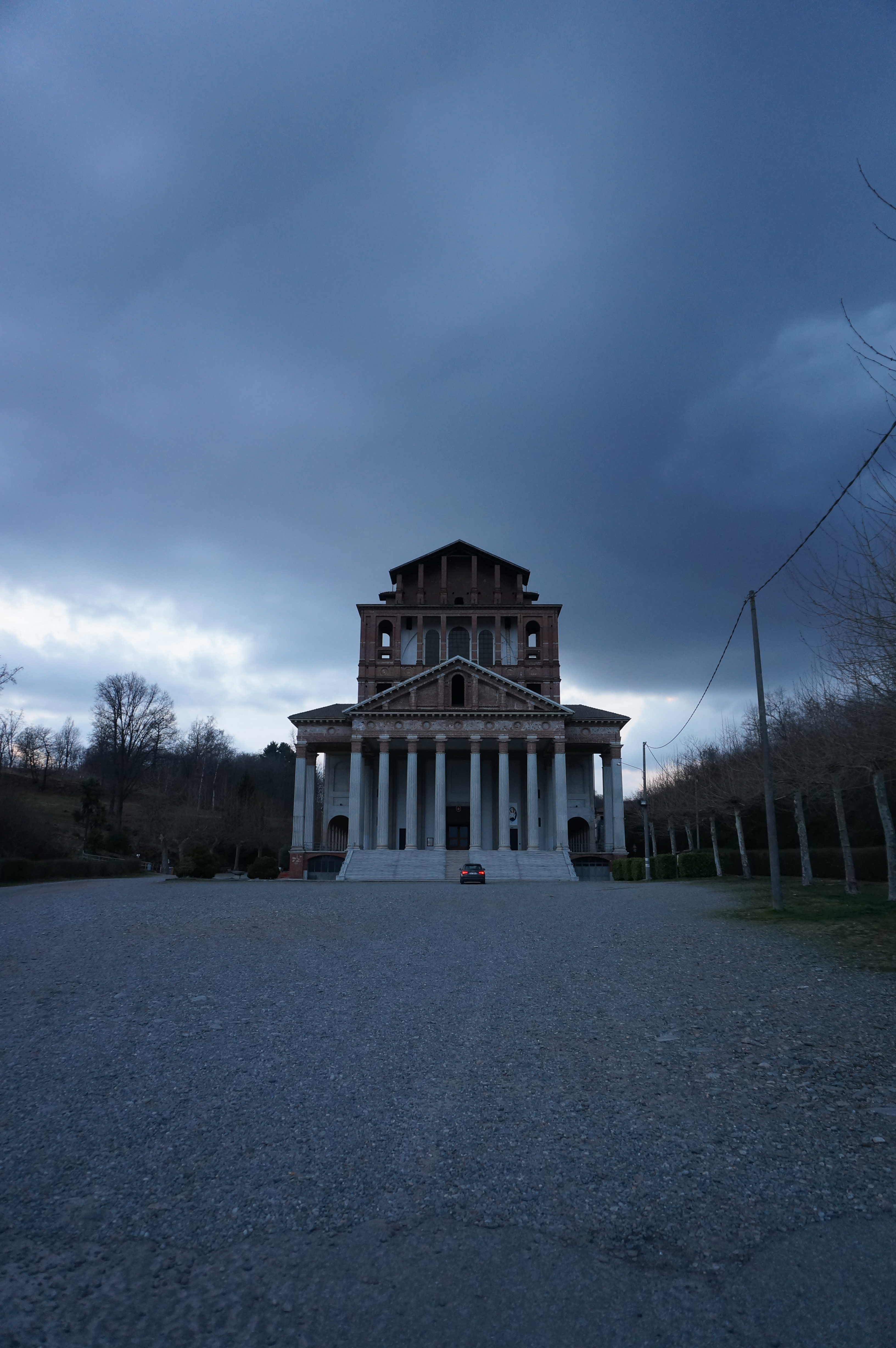 Nemmeno intorno alla chiesa, che è enorme, c’era anima viva. L’auto che è inopinatamente arrivata nel piazzzale, solitaria e abbastanza incongrua, dà l’idea delle proporzioni. L’insieme aveva qualcosa di vagamente familiare, e una volta trovato il provvidenziale cartello con lo spiegone ho capito perché. La cappella originaria, incastonata nell’abside e con il bassorilievo miracoloso della croce, esiste sin dal 1600. La chiesa nelle proporzioni attuali è stata costruita su progetto di Alessandro Antonelli nell’Ottocento. Lui era un architetto molto amante delle proporzioni gigantesche e in quel luogo in mezzo al nulla la chiesa sembra fuori posto; ma mettiamoci nei panni dei fedeli che l’hanno finanziata. Il luogo doveva essere molto frequentato, le pareti sono coperte di ex voto di guarigione, e davanti alla chiesa c’erano due bar e un ristorante, chiusi (quando sono andata non eravamo ancora in zona rossa come adesso). Come dicevo un silenzio abbastanza inquietante.