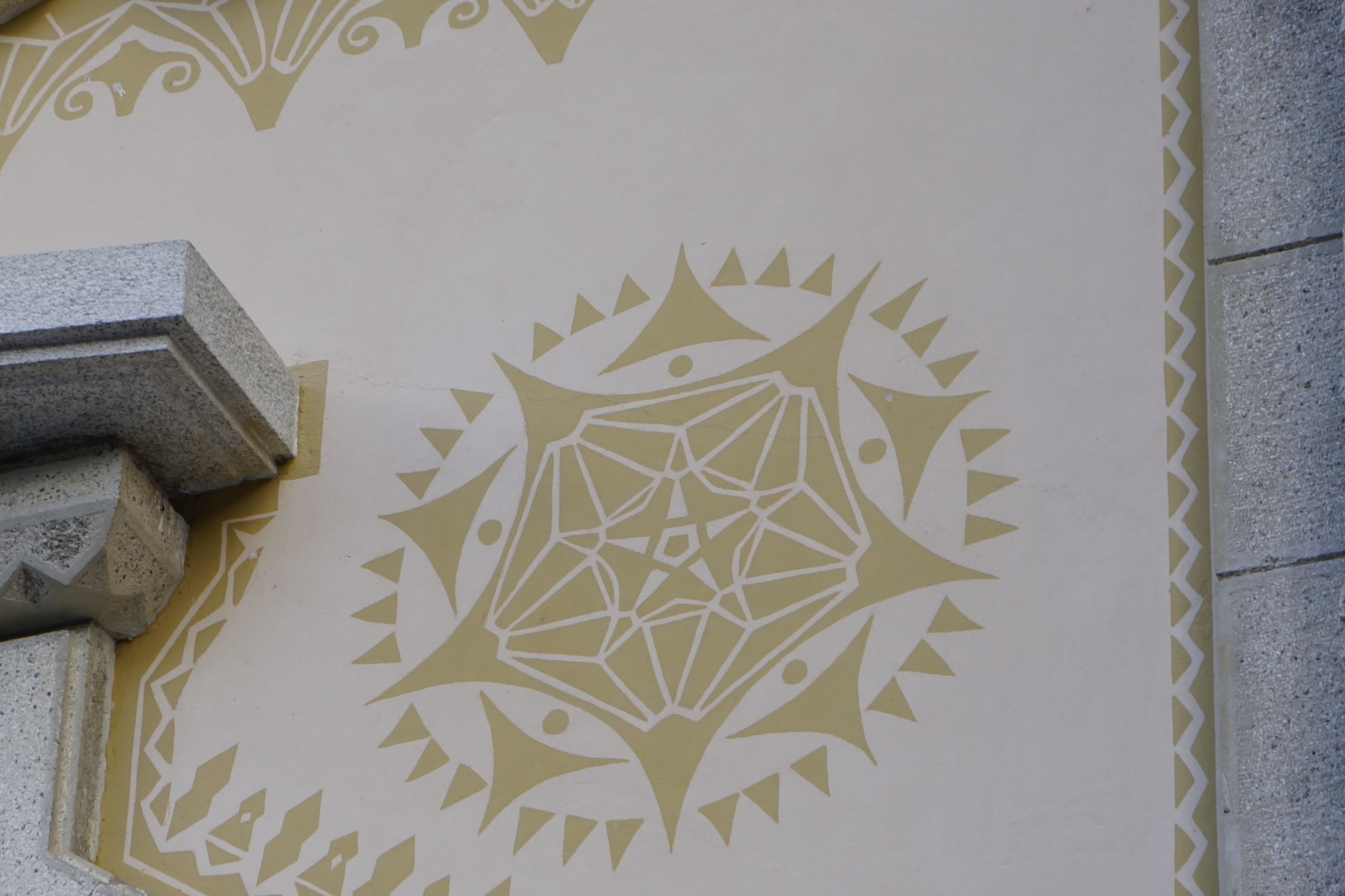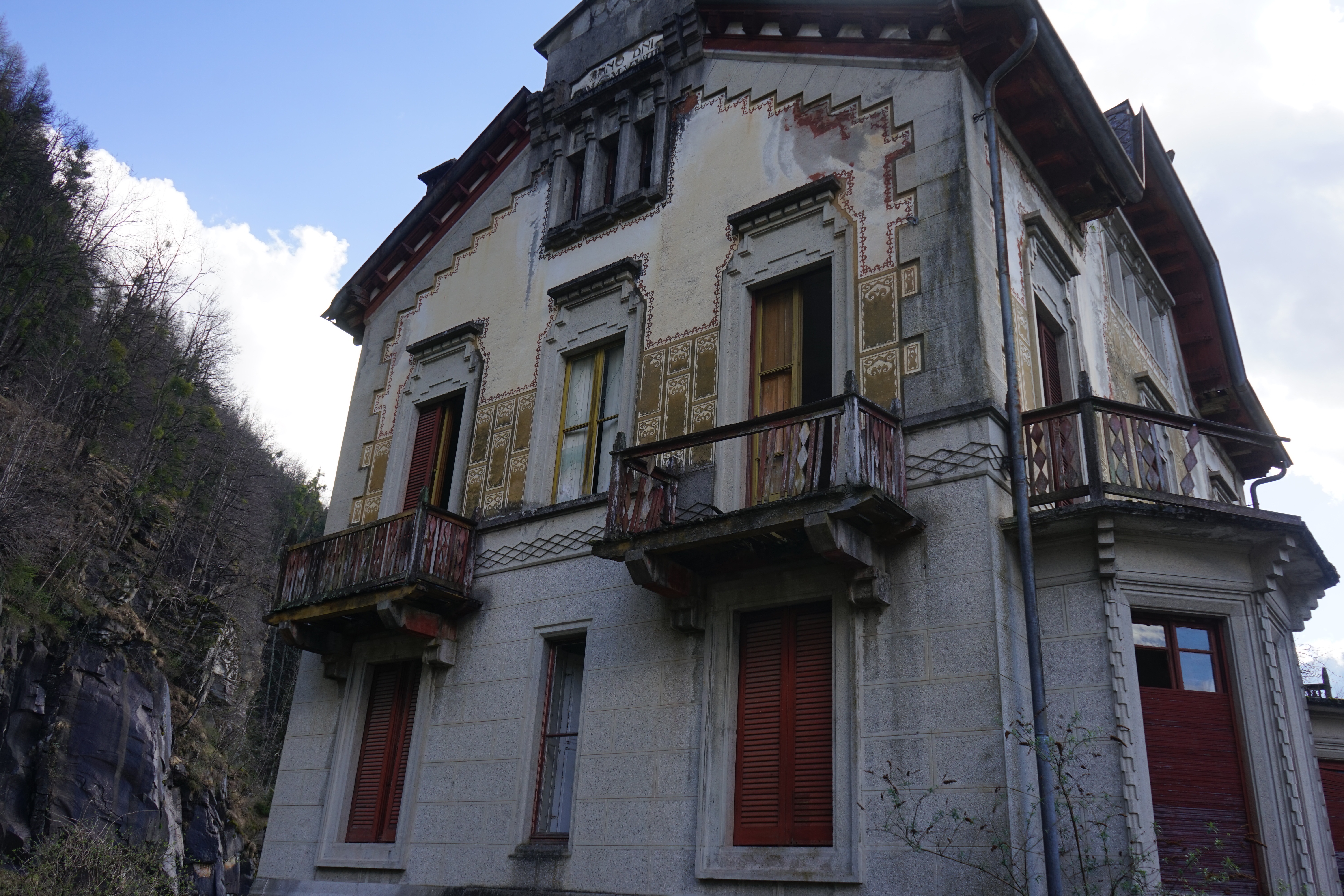 La decorazione è simile a quella di Verampio, anche se la centrale è stata costruita successivamente. Le grandi finestre hanno decorazioni pittoriche simili a rose dei venti, differenti e simmetriche, e finestrine simili a bifore. A fianco, molto danneggiata, la casa del direttore, con ancora tracce della decorazione originale. Come già detto le centrali elettriche all’epoca erano un sistema compiuto che prevedeva non solo gli edifici funzionali, ma anche quelli residenziali per dirigenti e maestranze.