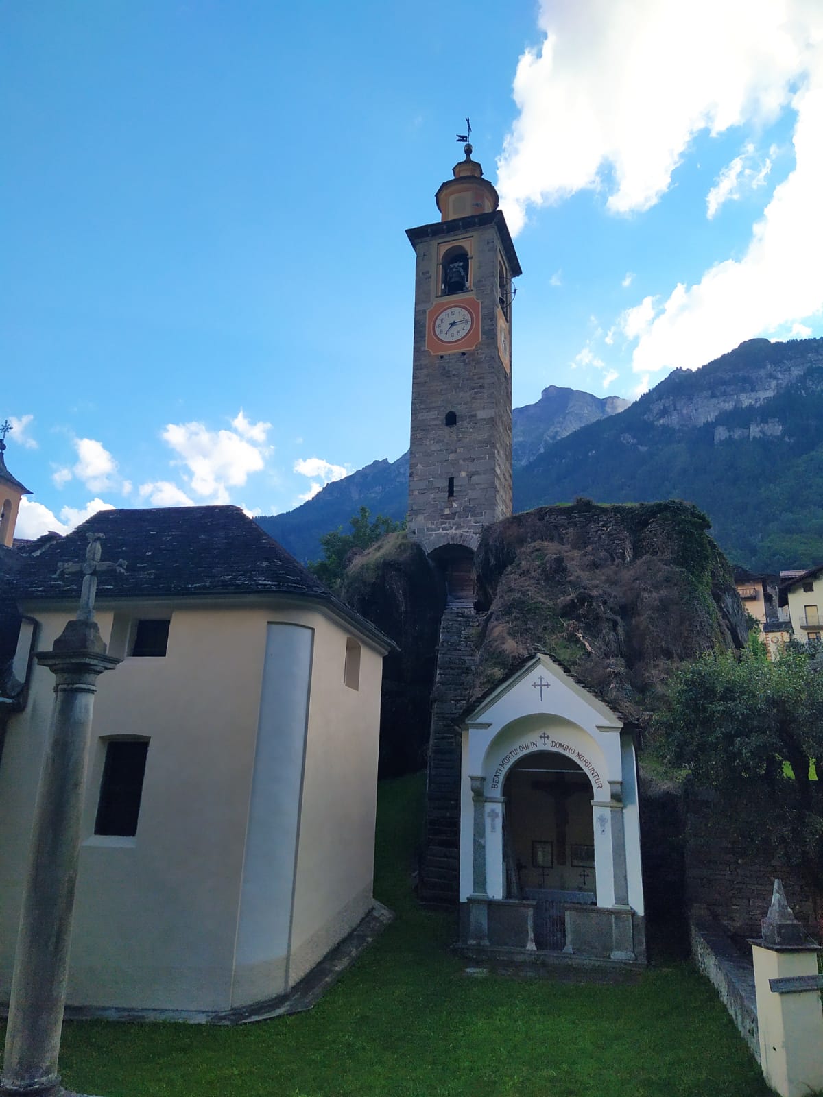 La seconda volta, al termine di un pomeriggio in cui avevamo fatto altro, abbiamo deciso di vederlo con più attenzione e ci si siamo ritrovati in mezzo a persone che prendevano l’aperitivo nel bar sulla piazzetta. Ci siamo fatti un giro, scoprendo che il piccolo paese aveva un numero ragguardevole di antiche case, e un campanile molto molto particolare, staccato dal corpo della chiesa e arrampicato su uno sperone di roccia.