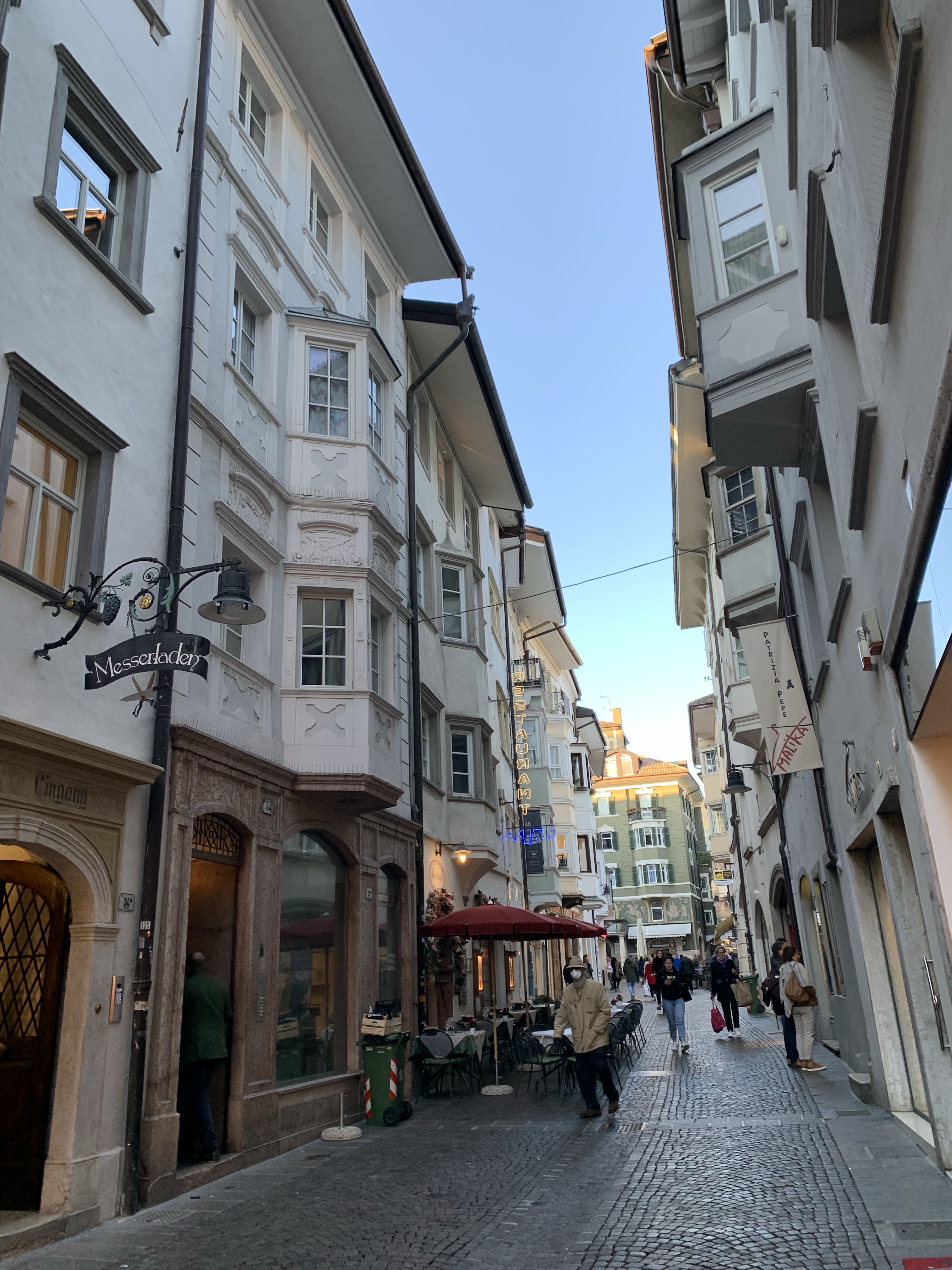 Alle spalle c’è la città medievale, di cui la via Portici costituiva il fossato delle mura. Il centro medievale ha bellissime case alte e strette, alcune con le facciate dipinte come a Innsbruck , e negozi di altissima qualità e prezzi corrispondenti. Lo stesso si può dire delle altre strade commerciali come via della Mostra e via degli Argentieri. Tutte convergono nella scenografica Piazza delle erbe, dove negli stalli si trovano verdure e specialità, esposte in maniera molto scenografica.