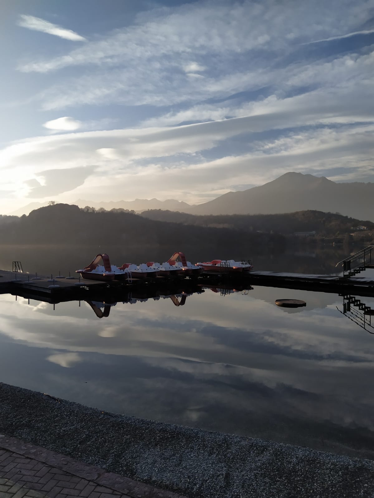 Abbiamo preso un caffè allo chalet Moia, che aveva appena riaperto dopo la pausa invernale, dove la gentilissima titolare ci ha chiesto il Green pass anche per sederci all’aperto e poi ci ha raccontato un po’ di cose, ad esempio che in estate il lago è un vero e proprio centro balneare e che nei boschi circostanti c’erano un po’ di sentieri e di luoghi panoramici – e soprattutto, che, potendo, in estate nei week end c’è una gran folla e quindi per noi asociali è meglio l’infrasettimanale. Ce ne siamo andate augurandole ogni bene e abbiamo preso lo sterratino che costeggia il lago sino alla piattaforma (chiusa) e poi sino alla svolta a fianco del ristorante “Il cigno”, chiuso pure lui, scoprendo che la stradina asfaltata che costeggia il lago in realtà è percorribile solo dai residenti. Quindi abbiamo camminato insieme a joggers in maglietta, per ritrovarci non molto lontano da dove eravamo partite (ossia il sentiero per il cosiddetto Roccione).