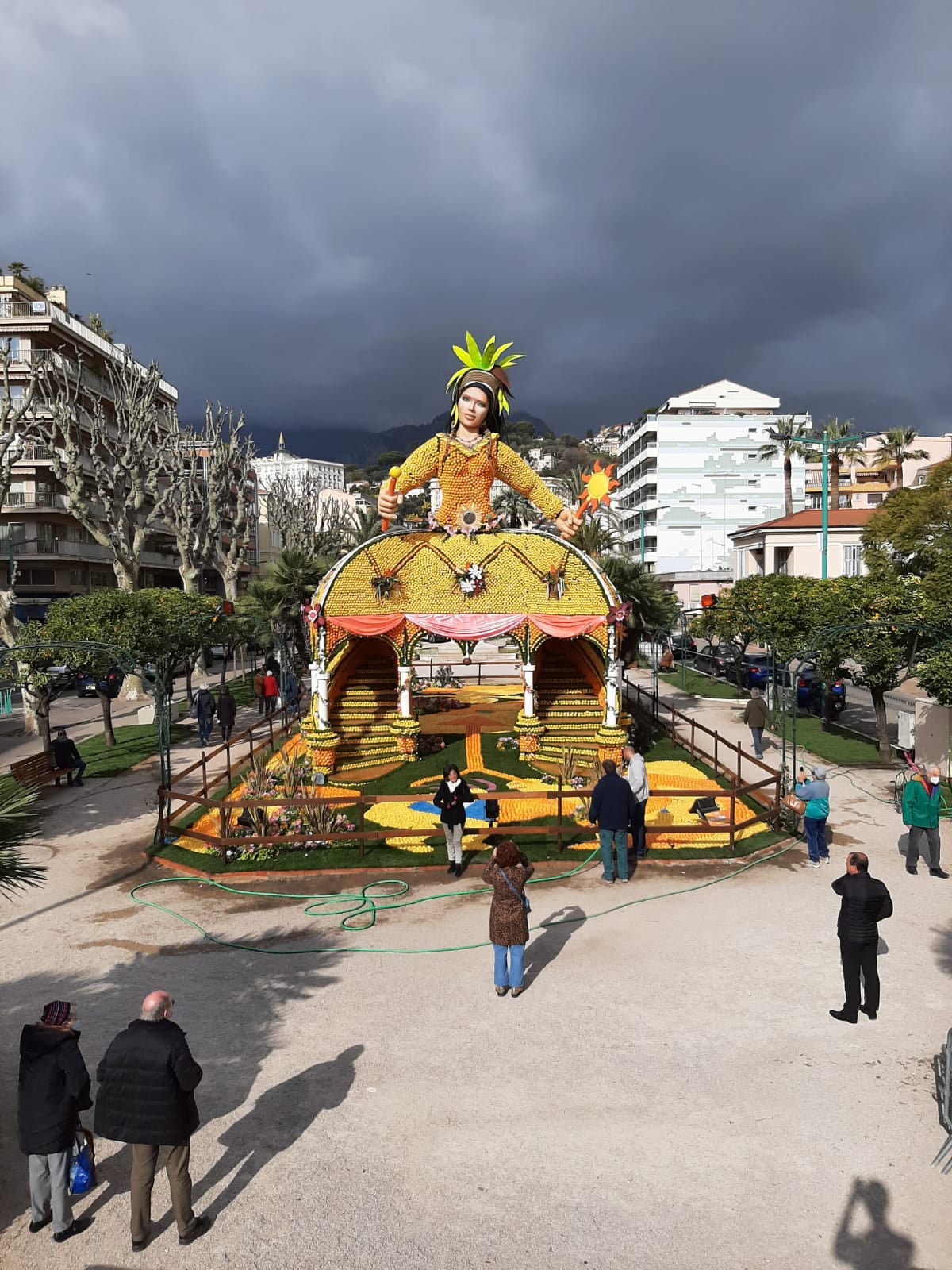 Anche a Mentone c’erano macchine altissime (un elefante), molte ballerine poco vestite ( e per fortuna la giornata era soleggiata) che si dimenavano con convinzione, ma in alcuni casi con scarsissimo senso del ritmo, e non molti agrumi (in un servizio di una radio locale si diceva che erano importati, perché il prezioso limone di Mentone, insomma, non si deve buttar via). Prezzi abbastanza popolari, 26€ per il posto in tribuna, 13 in piedi sulla strada. Questo il sito. E qui nessun carro viene bruciato alla fine. Le sculture di agrumi sono sempre molto complesse, quest’anno il tema è la musica e la danza, ed è interessante, più che il risultato finale, vedere tutto l’impegno che c’è dietro. Anche qui, tutti felicissimi, dimenticando per un attimo le beghe politiche che vedono il neo sindaco Yves Juhel (neo perché ci sono state elezioni supplettive dopo la morte di quello eletto nel 2020) denunciato per brogli da un’altra candidata. Sono settimane che volano stracci nella destra mentonnese, divertentissimo (quasi come come le elezioni che si terranno questa primavera nel natio Mandrognistan).