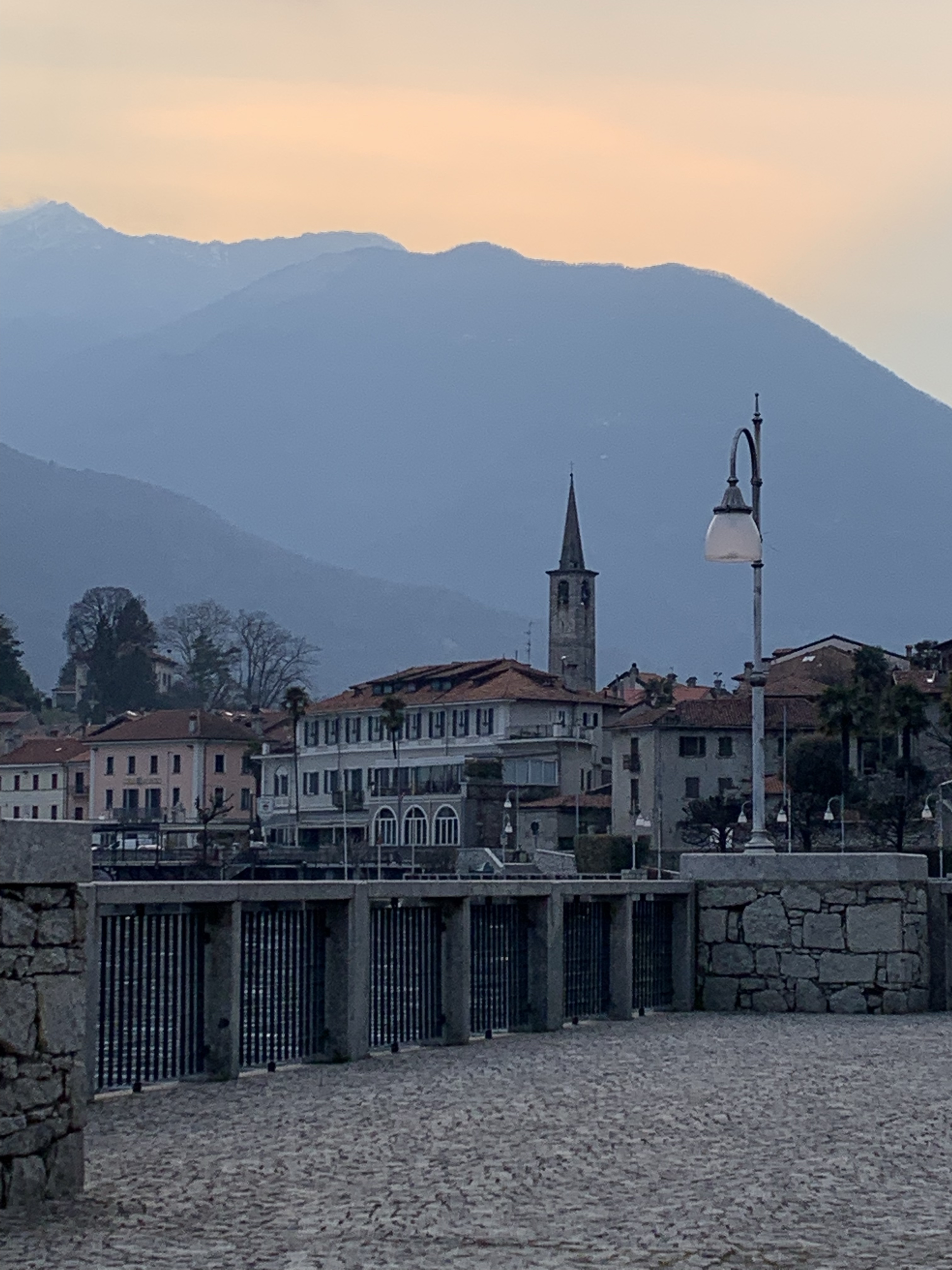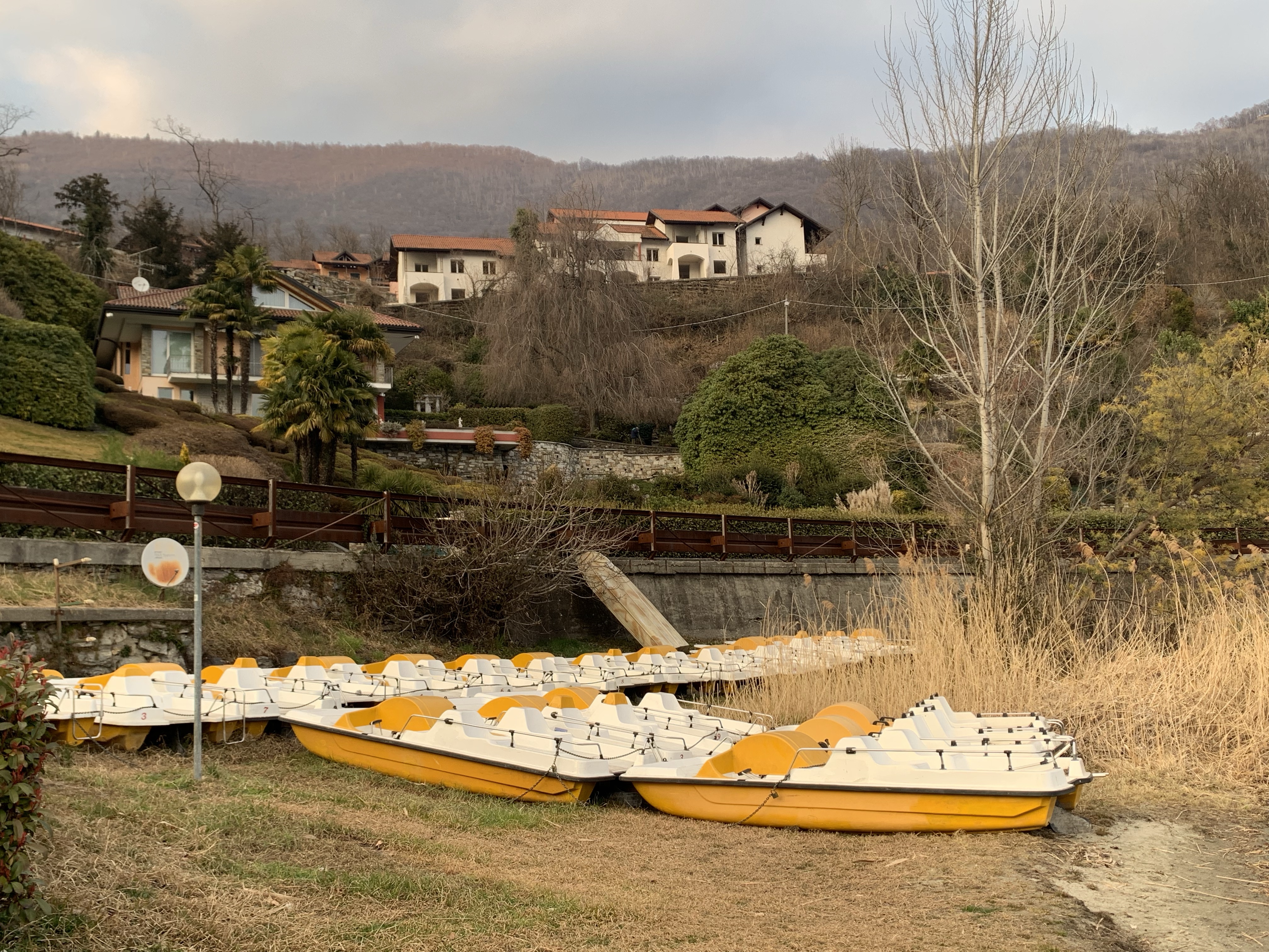 La scorsa settimana, prima delle due corse turistiche valdostane, mi sono presa un pomeriggio di quiete e meditazione a Mergozzo. Meditazione perché avevo voglia di un po’ di solitudine , un po’ di boschi, alle pendici del Mont’Orfano e poi ho deciso di percorrere la sponda del lago dove c’erano dei bambini e un cagnetto che facevano castelli di sabbia. Ho invidiato la loro energia: il tempo era tutt’altro che primaverile e tirava un vento decisamente freddo; anche i genitori erano infreddoliti. Poi mi è venuta voglia di costeggiare il lago dalla parte della strada e ho visto che il marciapiede era utilizzabile ben oltre il campeggio Lago delle Fate. Anzi: la spiaggia era percorribile e c’erano tracce di lampioni appena piantati (forse per una costruenda pista ciclabile?). Quindi, ho scoperto dopo un secolo, la spiaggia prosegue, c’è un bar estivo in mezzo agli alberi, e si può camminare a filo d’acqua molto più a lungo di quanto pensassi.