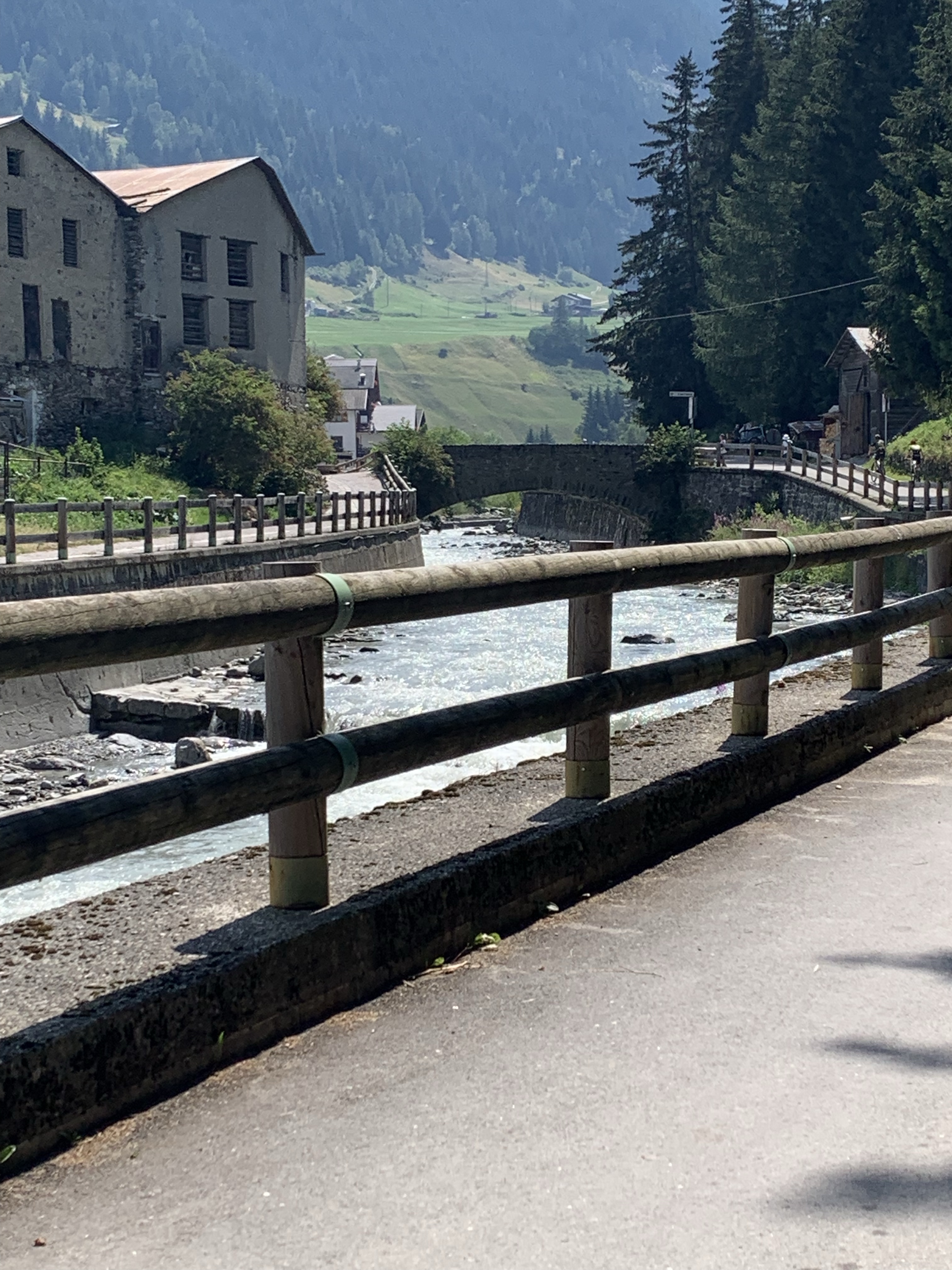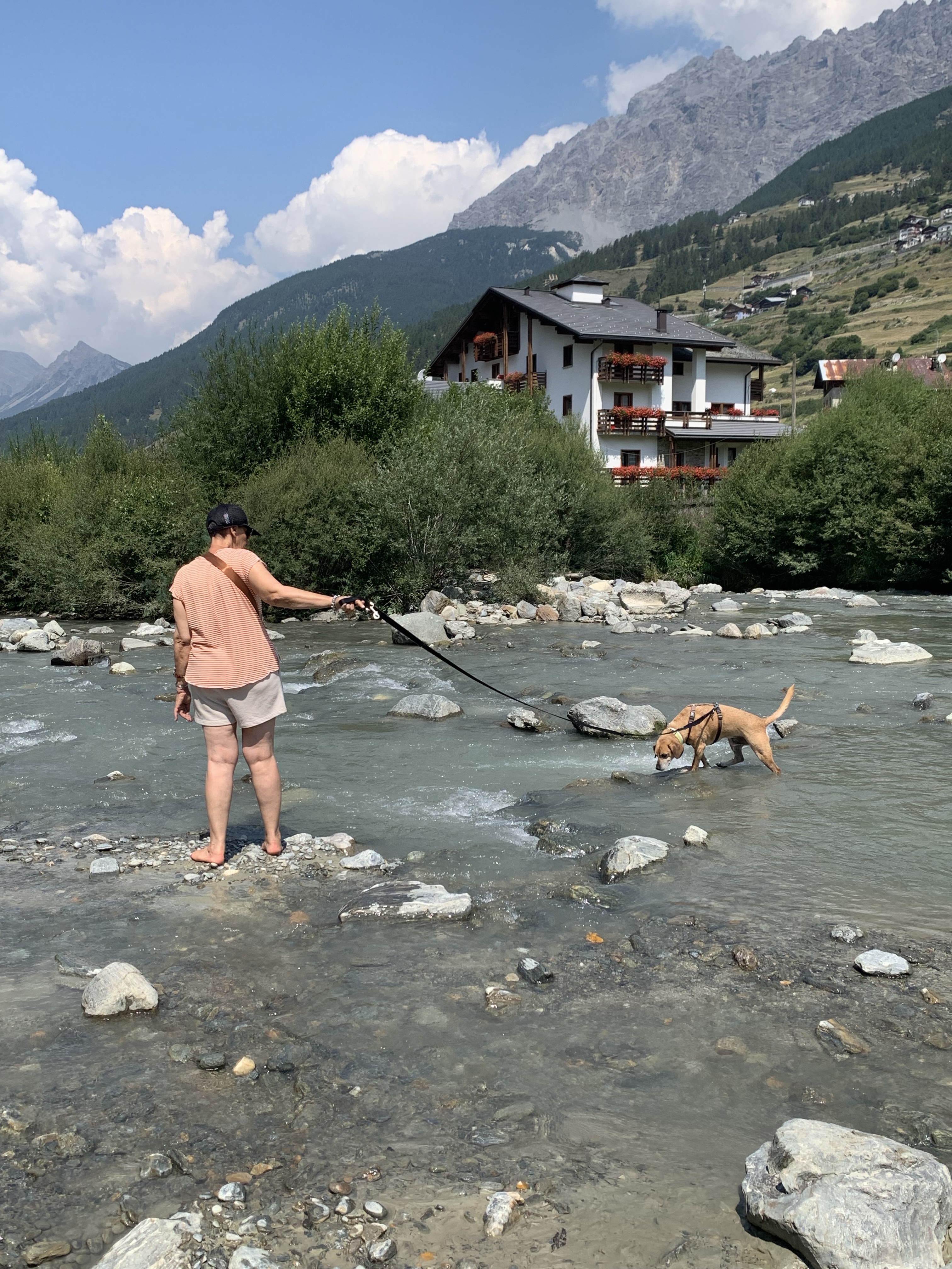 Comunque, se non vi basta il sentiero Viola, da Bormio verso la Valfurva c’è il sentiero Frodolfo ( che è un torrente, non una persona). Inizia come trafficata passeggiata lungo il torrente ai piedi di Bormio e arriva in città vecchia. Trafficata vuol dire un mucchio di bambini e cani a passeggio e giravolte varie con Tobia, il che è sempre una fatica perché non sai mai cosa gli passa per la testa quando vede un altro cane maschio – con le signorine anche a quattro zampe di solito è piacione, cioè annusa gentilmente.