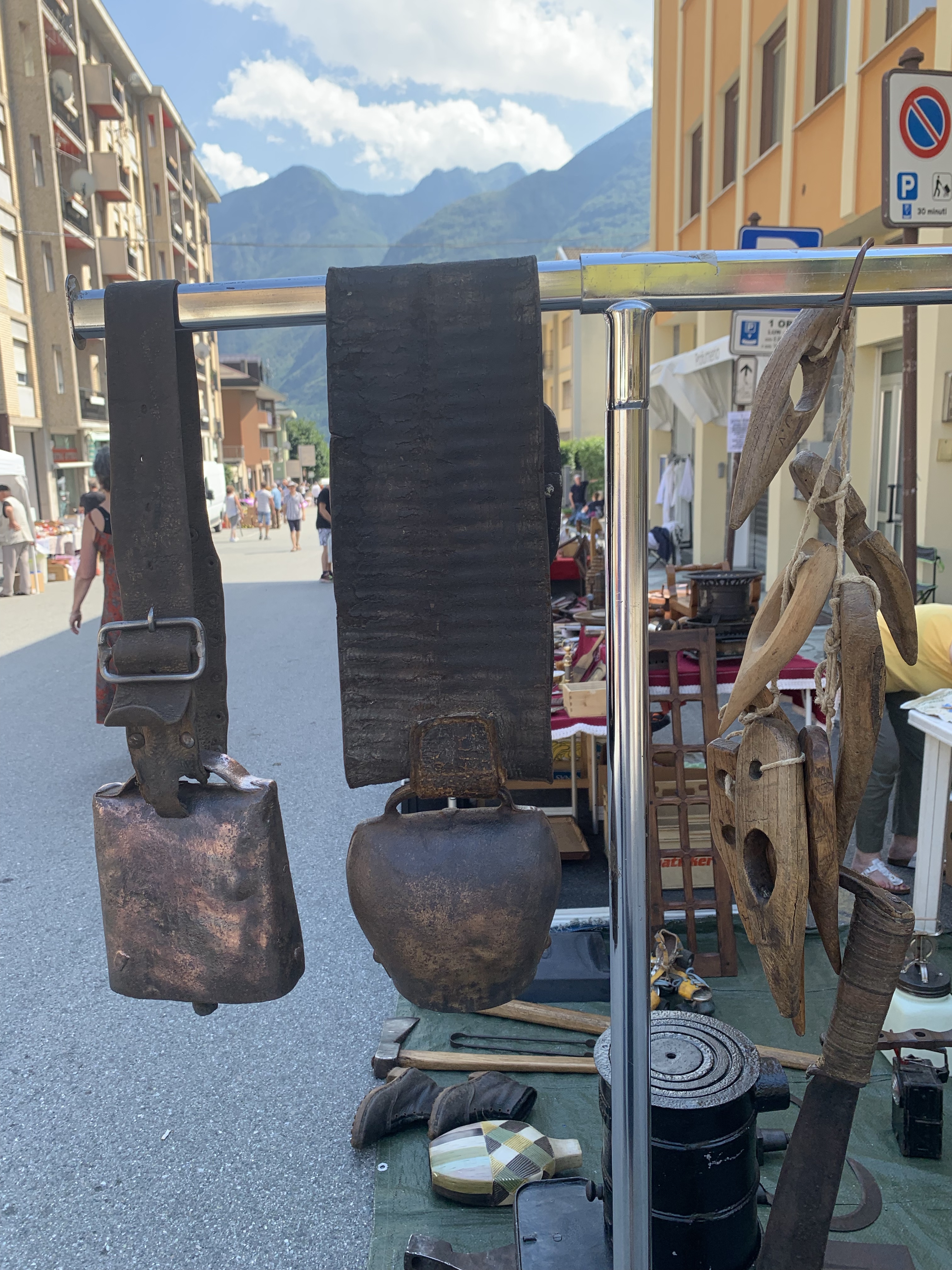 A Verrès, sempre domenica 7 c’è il mercatino dell’antiquariato, che è uno dei più graziosi tra quelli che frequento, nelle vie del centro storico, quindi con il non trascurabile vantaggio di essere all’ombra. Molti degli espositori sono davvero simpatici e sono per lo più della zona o del Canavese. Le foto si riferiscono all’edizione del mese scorso. Ho sempre incontrato persone che conoscevano la storia di ogni oggetto che vendevano. In particolare nella foto in alto a sinistra, quello che pare una roncola in realtà è un …accessorio da pozzo! (Ossia un gancio per appendere i secchi: io per prima cosa ho pensato a qualcosa che servisse ad appendere dei salami – il cuore va sempre lì)