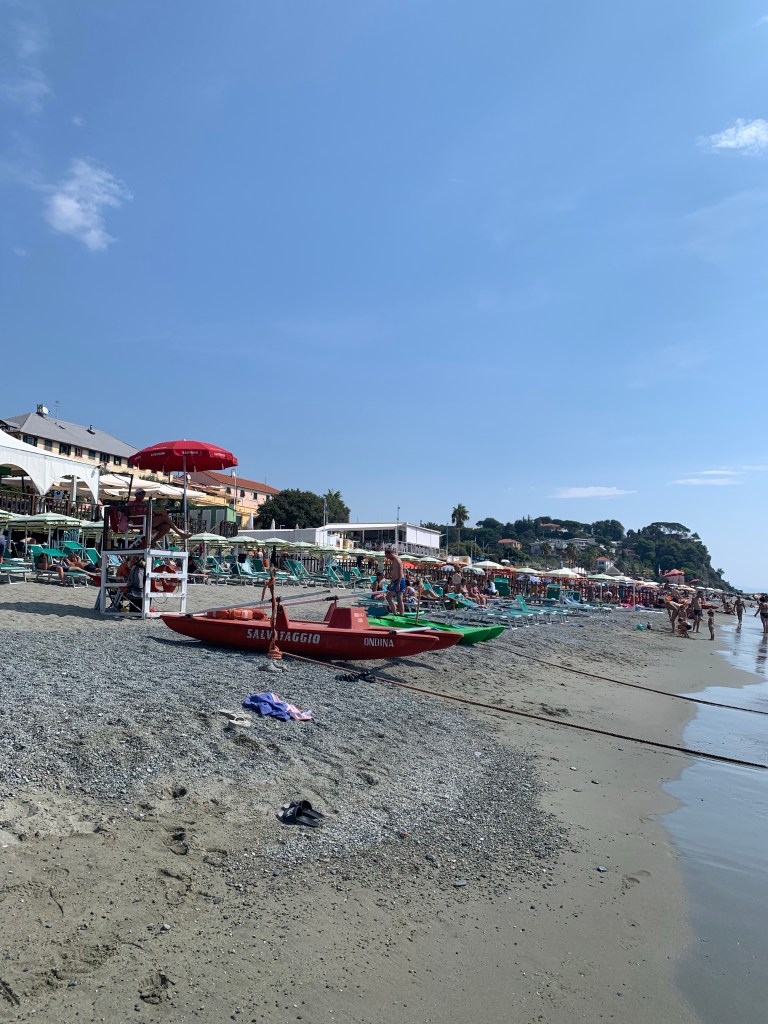 Problema numero uno: l’ombrellone vola. Lo avrete capito, siamo in una spiaggia libera. Albisola è probabilmente uno dei pochissimi posti in Liguria dove la spiaggia libera e gli stabilimenti sono 50/50. Bello, ventilato, acqua pulitissima e l’ombrellone volava davanti ai sogghigni di variegato pubblico multietnico ( fatti i c…tuoi non si applica ai vicini di ombrellone in generale e in particolare in una spiaggia libera). Insomma, metà in acqua, metà aggrappati all’ombrellone