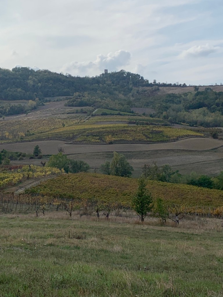 Sì, avete letto bene, un luogo che nemmeno sapevo esistesse, nell’Oltrepo pavese. In realtà Luisa ricordava un posto da qualche parte sopra Casteggio dove era stata una volta e che era bellissimo. Il posto è appunto Borgoratto Mormorolo, sulle colline dopo Borgo Priolo, non molto lontano da Casteggio, a due passi da casa sua e una cinquantina di minuti mal contati da Mandrognistan Ville, ma in un’altra provincia e in un’altra regione. Avvicinandoci al luogo, veniamo informati da minacciosi cartelli che in paese è in corso di svolgimento la Festa d’autunno, di cui nessuno ovviamente era al corrente, e quindi abbandoniamo l’auto (la Cinquecento) nel primo campo disponibile – e poi l’abbiamo recuperata senza finire nel fosso, ma sorvegliate da graziosi canetti similpointer dietro un cancello.
