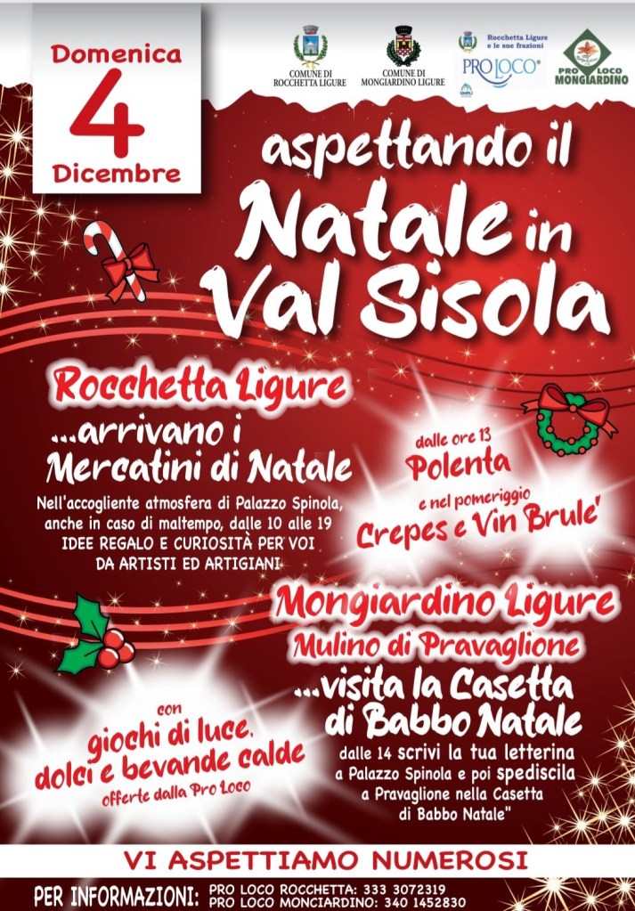 Il Natale in Val Sisola, a Rocchetta Ligure, dove gli stand sono all’interno di Palazzo Spinola, ottima idea se dovesse piovere (e pioverà, pare). Nel palazzo ha anche sede il Museo della Resistenza e della civiltà contadina, che vi consiglio caldamente di visitare. E se avete dei bambini potete portarli a Mongiardino da Babbo Natale.