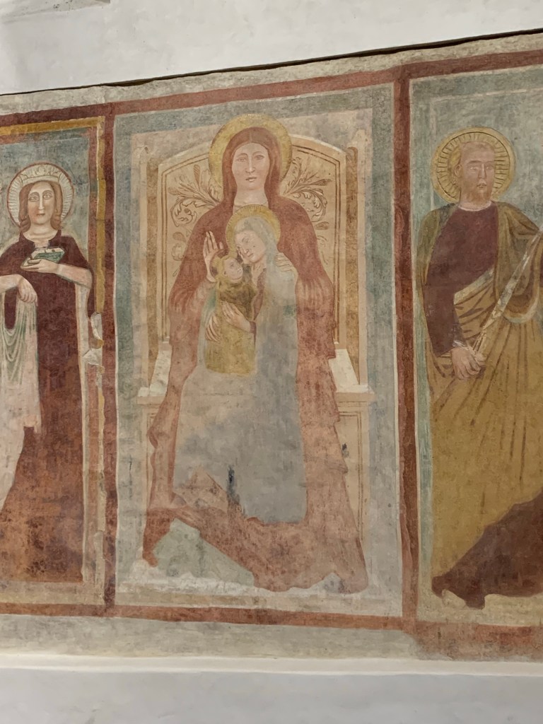 Poi un altro. Poi due rossini ( mamma e figlio? ) che si fanno accarezzare. Poi vedo una specie di casetta ma in effetti il mio cervello non la registra del tutto perché la chiesa è aperta e si vedono gli affreschi. Entriamo e dentro c’è la signora.