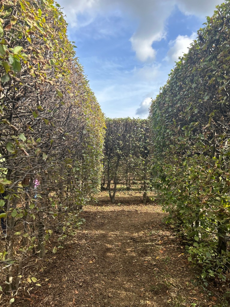Il castello, come prezzo, non è convenientissimo, se non siete soci del Fai, ma è assolutamente consigliabile: feudo della potente famiglia Valperga, trasformato in dimora signorile e perfettamente conservato, ha interni molto interessanti se come me siete amanti di ceramiche e mobili (e i giovani volontari del Fai che abbiamo incontrato hanno raccontato molte storie interessanti) e dalle terrazze il panorama è davvero mozzafiato, specie se siete baciati da una giornata limpida. I giardini sono assai ben curati, e dal labirinto, un po’ grazie a Vale un po’ a caso siamo usciti rapidamente (c’è una chiave per uscire molto semplice da individuare se ci sono arrivata anch’io). Dato che c’era il mondo, abbiamo parcheggiato a casa del diavolo (il tutto gestito militarmente dai volontari della protezione civile, tanto di cappello) e a forza di saliscendi diecimila passi e otto km li abbiamo fatti. In coda per quasi tutto, abbiamo intrecciato interessanti relazioni…e sì Amica Giovane ha trovato il suo melo (si chiama mela Carla, che anche per me come chi mi conosce sa è una bella coincidenza)