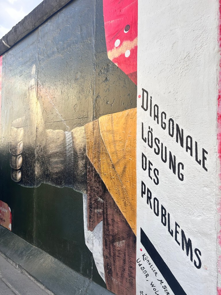Il muro è anche un museo a cielo aperto. Non solo perché racconta una parte considerevole della storia della città, ma perché è coperto da graffiti e murales che sono essi stessi una parte di storia a partire dal famoso Bacio tra Breznev e Honeker – non il migliore o il più interessante di quelli che si trovano lungo la Sprea, nella parte orientale della città (si raggiungono facilmente dalla fermata della metropolitana di Warschauer Platz, se si riesce a sopravvivere all’attraversamento berlinese del corso- ho notato che l’atteggiamento di auto pedoni e ciclisti è, come dire, molto italiano, tutti passano dappertutto. L’energica signora turca che guidava quel pomeriggio il nostro pullman li odiava proprio i ciclisti, tanto che l’ho capito persino io con il mio tedesco che non si schioda dall’A2). Se poi passate accanto al famoso Checkpoint Charlie, ed è quasi impossibile non notarlo, capirete anche perché molti berlinesi, dei due lati della città- che per alcuni aspetti sono diversi davvero, odiano anche quello.
