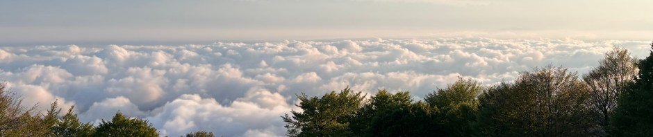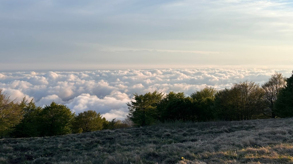 Domenica eravamo oltre le nuvoli e il panorama al tramonto spettacolare. E sì, avevo un abito simil elegante, perché a primavera smetto finalmente con i pantaloni, e un soprabito Max Mara (mettersi/togliersi il costume da bagno è più facile per me se ho un abito addosso. o una gonna). Su ci voleva l’orsetto, che mi è stato prestato.