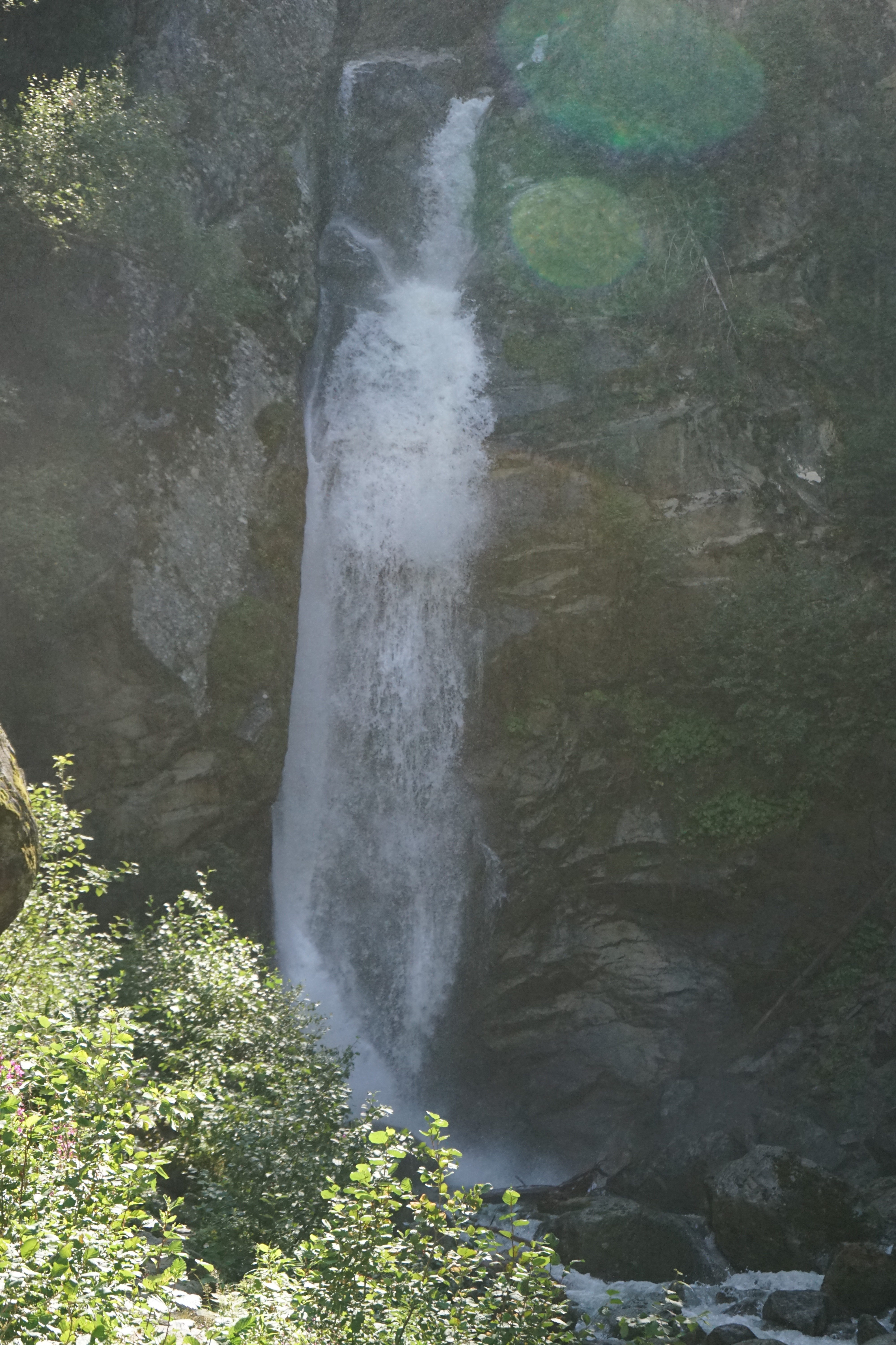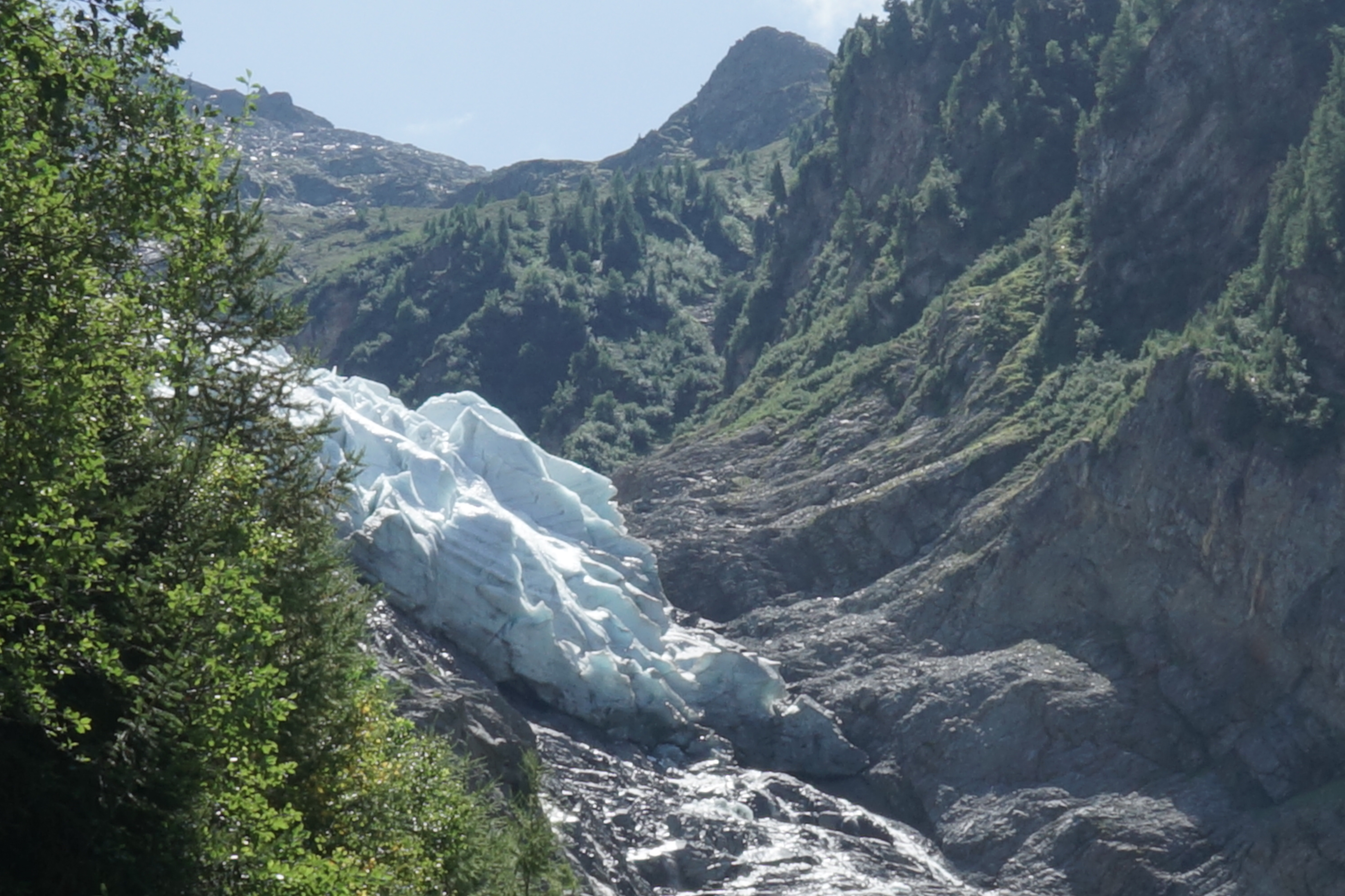 La prima foto è nota, perché l’ho già postata sui social. È il ghiacciaio di Bossons, un tempo meravigliosa lingua glaciale che sfiorava la statale del traforo sul versante Francese del Monte Bianco. Lo potevi vedere da vicino con una facilissima passeggiata in partenza dal piazzale del traforo, arrivavi allo chalet du Cerro, prendevi una coca e ascoltavi i seracchi cadere nelle giornate calde; una passeggiata che non amavo particolarmente proprio per il caldo. Adesso, abbandonare la macchina nelle vicinanze del traforo non è più possibile perché dal versante italiano non puoi fare inversione di marcia, ma io ho appena astutamente acquistato ( mi è impossibile entrare alla Buona Stampa di Courmayeur senza acquistare qualcosa) la nuova Escursioni a Chamonix di Marco Romelli (Villa di Teolo, PD, Idea montagna, 2019), dove a pag. 87 è descritta l’escursione alla cascade du Dard con partenza appunto da Chamonix. Io venivo da Courmayeur, potevo lasciare l’auto nell’apposito parcheggio, e dopo la cascata, prendere il ben descritto prolungamento e salire al Cerro e così spendere bene il mio tempo in una giornata particolarmente soleggiata e calda. La cascata come potete vedere dall’ultima foto era più spettacolare del solito, e con una facile passeggiata che traversa sotto la strada attraversa con una spettacolare passerella il torrente de la Creuse ( persino troppo spettacolare) all’altezza del bivio per la Para e la Gare de Glaciers e infine, anziché prendere lo stradone che è percorribile dalla Jeep del Cerro, ti conduce a metà dello sterrato, attraverso il bosco con la sola compagnia dei trail runners che vanno molto più veloce di me. Così arrivo tranquilla al Cerro e quel che si vede da lì è intuibile dalla seconda foto dall’ alto: betulle e ghiaioni. Del ghiacciaio che scorreva lì sotto , perfettamente raggiungibile da un escursionista esperto, nessuna traccia.